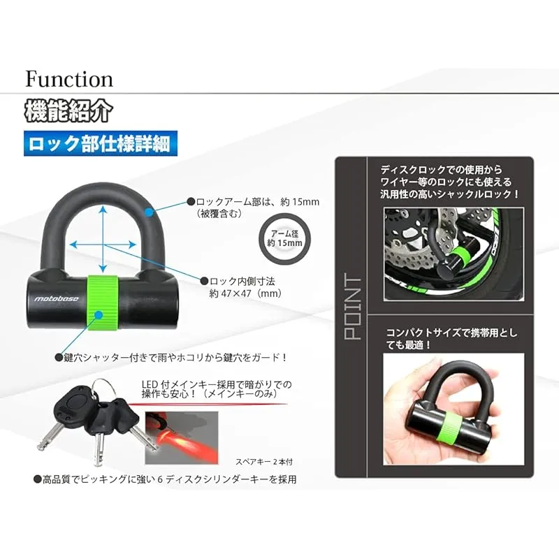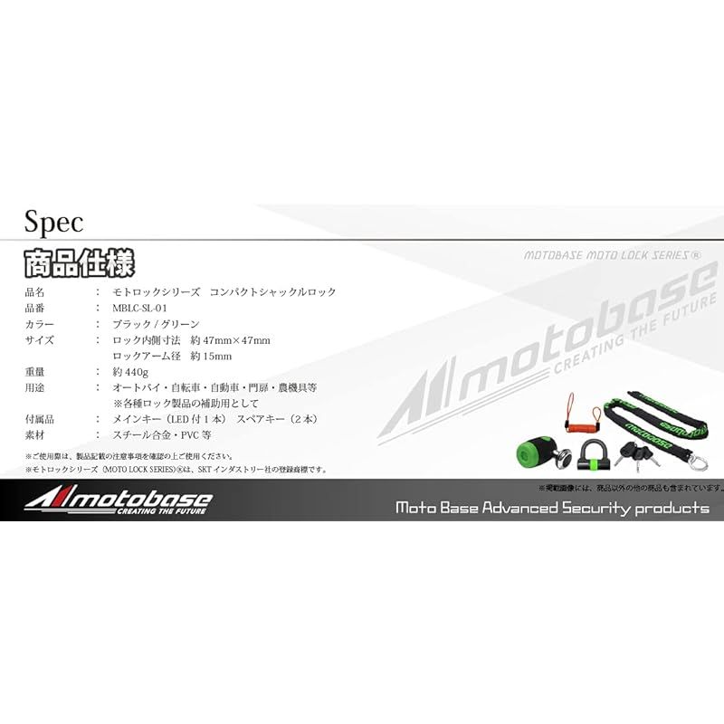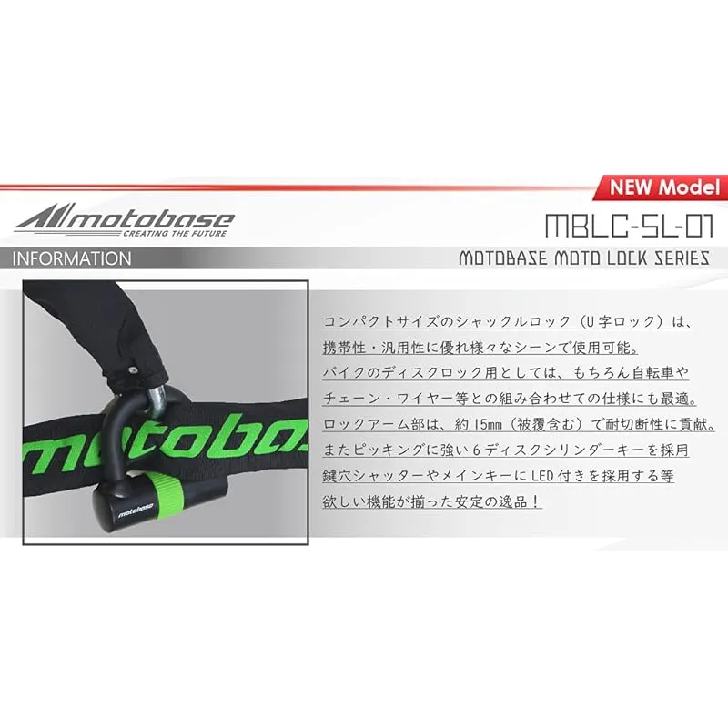 【商品詳細】 ブランド:MOTO BASE(モトベース) 商品種別:車&バイク 商品名:モトベース(MOTO BASE)盗難防止用品 モトロックシリーズ コンパクトシャックルロック (U字ロック)ブラック/グリーン MBLC-SL-01 製造元:SKTインダストリー 商品番号:MBLC-SL-01 色:ブラック, グリーン