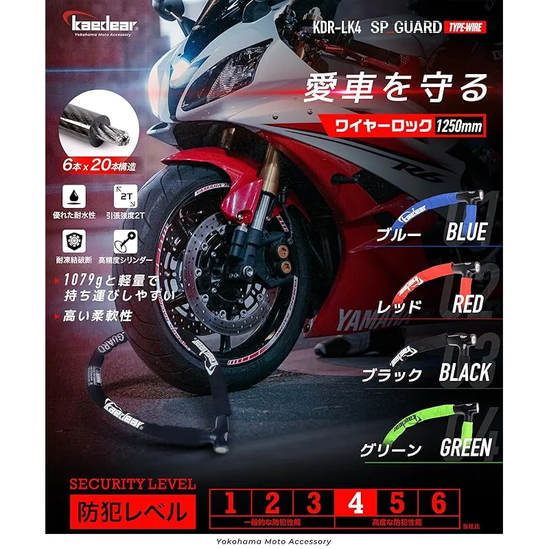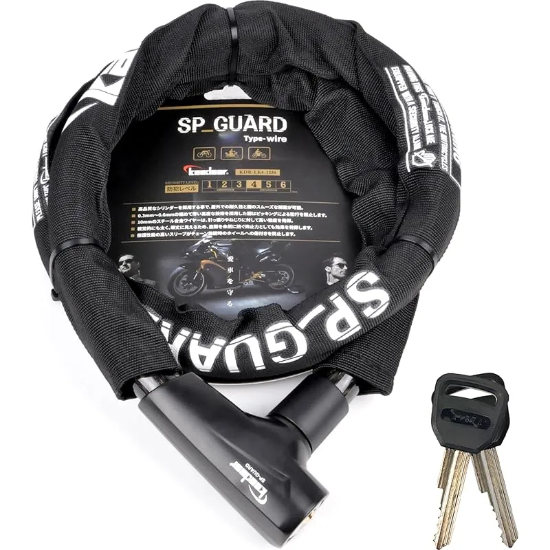 【ワイヤーロックの特長】 1079gと軽量で持ち運びしやすく、ツーリングバッグやリュックにも収まりやすいサイズ感です。使用しないときはコンパクトに巻いて収納できるため、常に携帯しても負担になりません。柔軟性に優れたワイヤー構造により、車体フレームやホイール、フェンスやポールなど様々な場所に自在に巻き付けることが可能です。 また2Tの油圧せん断に耐えられる炭素鋼の圧倒的な耐切断性能に、PVCカバーが加わり、大切な車体やパーツを傷つけにくい設計。 一般的なワイヤーロックは7本のワイヤーで1束×7本で編まれていることが多いですが、本製品はワイヤー20本x6本の120本で構成されています。