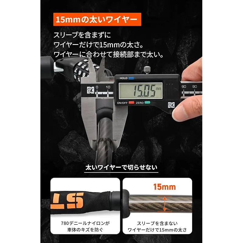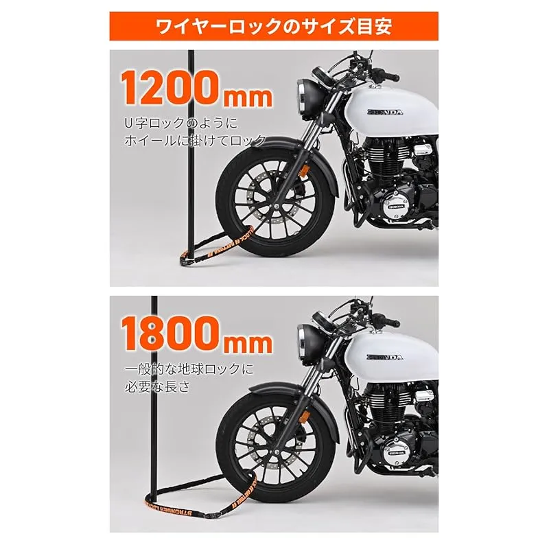 【商品概要】 pattern:ダイヤルタイプ/ブラック style:Lv.2:φ15mm/1.2m: 軽量で持ち運びが簡単なワイヤーロック。外出先でもロック可能 ワイヤー部分だけで15mmの太さがあり切断させない 頑丈な780デニールのナイロンカバーとPVCチューブでワイヤーの腐食と車体へのキズを防止 ロック部はカギ持ち運びが不要なダイヤルタイプ ホイールに掛けてロックするのに使いやすい長さ pattern:鍵タイプ/シルバー style:Lv.2:φ15mm/1.2m: ロック部寸法34×35×80(mm) 重量:670g ワイヤーロック径:φ15mm