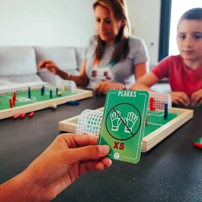 ミニプラックスは、サッカーの興奮を卓上で楽しめる革新的なフィンガーサッカーゲームです。木製のフィールドボードに色鮮やかなプレイヤーピンを配置し、指で操作してゴールを目指します。本格的なサッカーフィールドのマーキングが施された緑のプレイエリアには、両端に白いゴールネットが設置されており、リアルな試合体験を提供します。赤と青のチームカラーで分けられたプレイヤーピン、複数のボール、そして戦略的なプレイを促すカードが含まれています。家族や友人との対戦に最適で、戦術的思考と手先の器用さを同時に鍛えることができます。コンパクトなサイズながら、本格的なゲームプレイが楽しめるため、リビングルームやテーブルの上で手軽にサッカーの熱戦を繰り広げることができます。子供から大人まで幅広い年齢層で楽しめる、エキサイティングなテーブルトップゲームです。ゲームルールは簡単に習得でき、何度でも繰り返しプレイしたくなる中毒性があります。