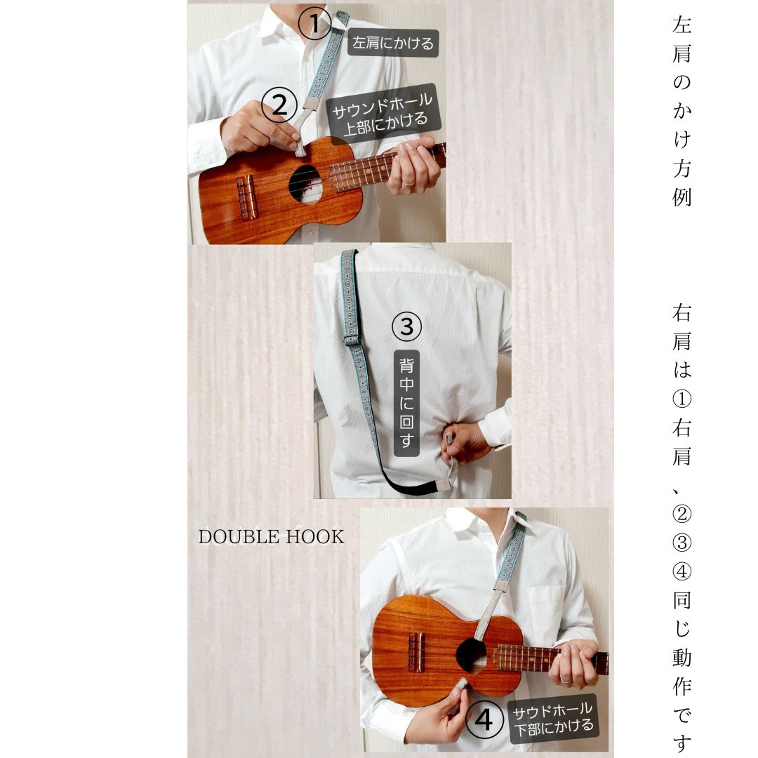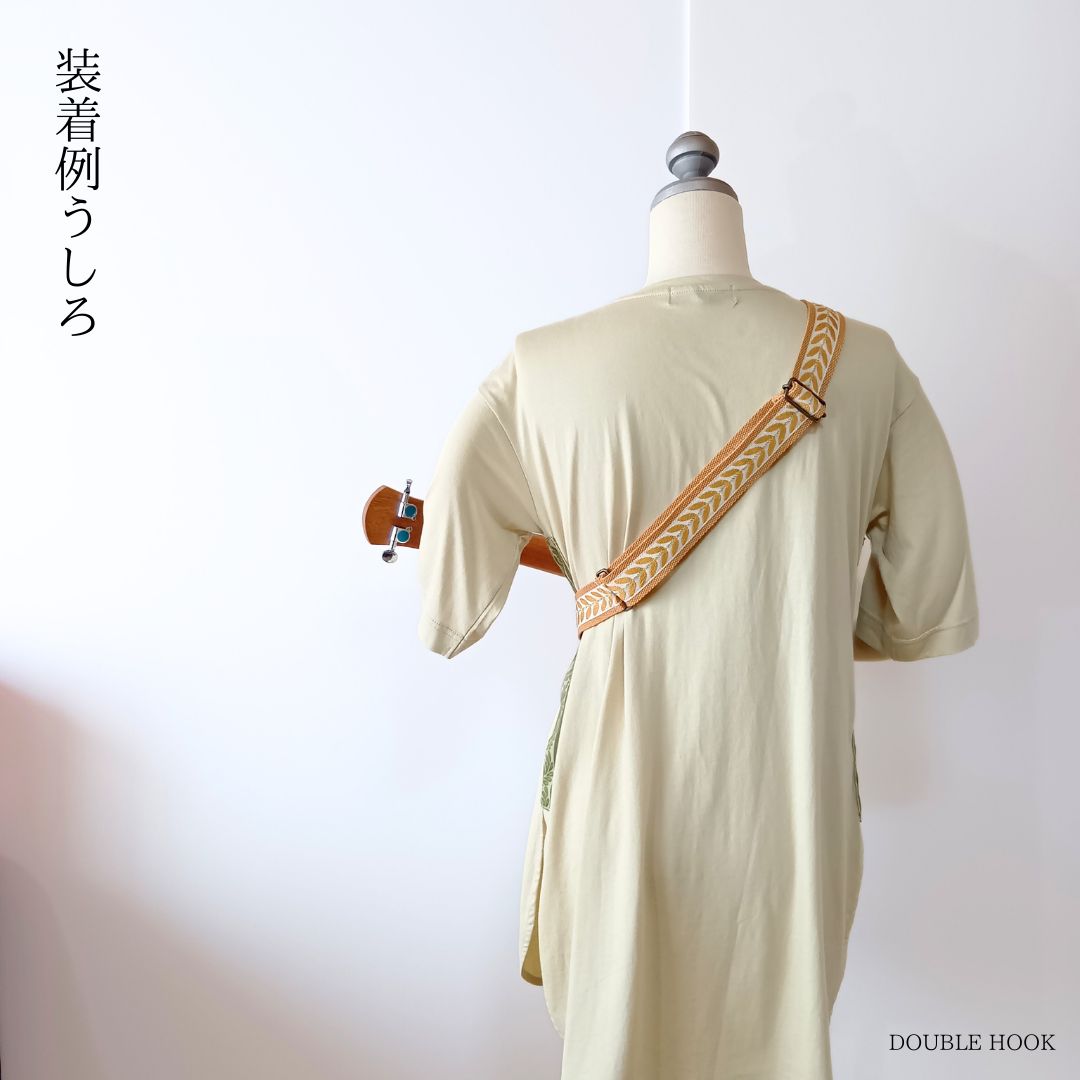 ・ストラップを肩にななめ掛けし、サウンドホールの上下にフックを引っ掛けてウクレレを支えることで、安定感があり弾きやすくなり、きれいなフォームが身に付きやすいです。