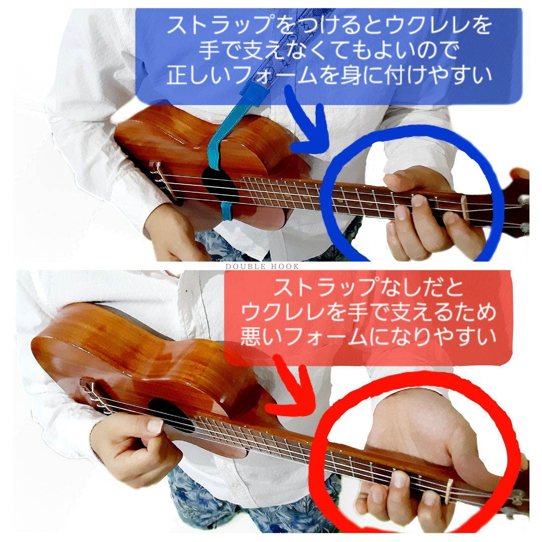 ・ストラップを肩にななめ掛けし、サウンドホールの上下にフックを引っ掛けてウクレレを支えることで、安定感があり弾きやすくなり、きれいなフォームが身に付きやすいです。
