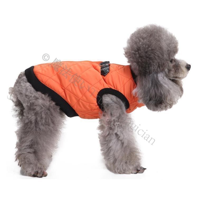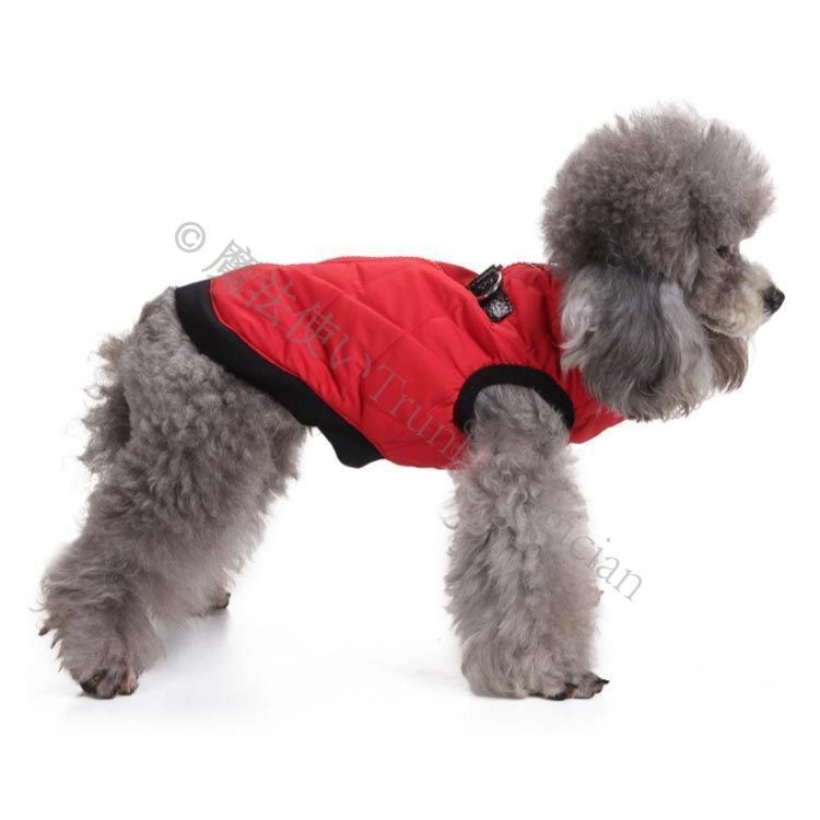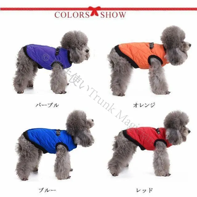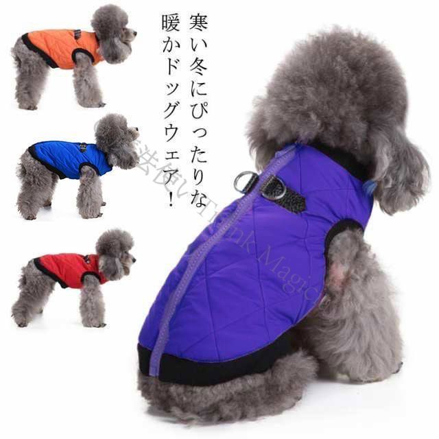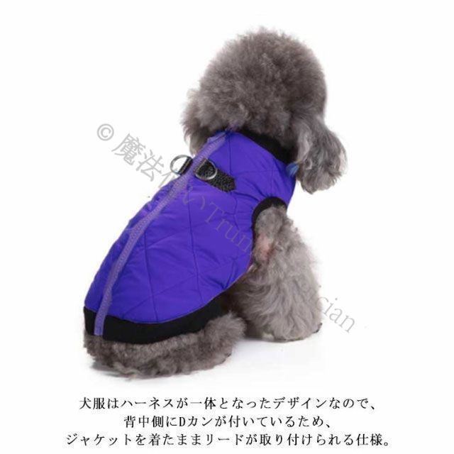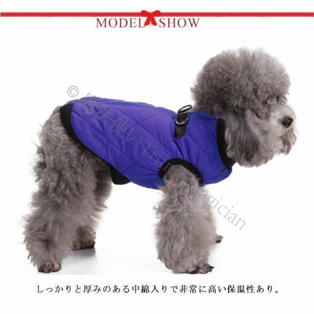 【XL】胴回り52cm 首周り40cm 背丈38cm 素材:ポリエステル 色:パープル オレンジ ブルー レッド 寒い冬にぴったりな暖かドッグウェア!中綿入りのキルティングジャケット。 犬服はハーネスが一体となったデザインなので、背中側にDカンが付いているため、ジャケットを着たままリードが取り付けられる仕様。 首輪が使えない犬におすすめです。背中ファスナーなので脱ぎ着させやすく、毛の巻き込みを防止する当て布も付きます。 しっかりと厚みのある中綿入りで非常に高い保温性あり。 袖無しタイプのダウンジャケットはちゃんと暖かくて動きやすい! 中綿素材は水濡れに強く、お洗濯しやすいため汚れても丸洗い可能です。 寒がりな愛犬ちゃんの冬のアウターにぴったりです。 取引の際の注意事項: メルカリ店では、最大10個までしか選択肢を設定できません。 ご希望の色?サイズをご注文後、ご注文番号とともにメッセージでお知らせください。 いただいた内容に沿って、サイズと色を手配いたします。 送料について ?全国送料無料(以下の地域を除く) ?沖縄県、離島地域には別途2,000円の送料がかかります。 ?上記の地域には、商品ページにて別途送料を請求させていただきます。 ご注意事項: ※サイズは手作業での採寸のため、1?109cm程度の誤差が生じる場合がございます。 ※モニター環境や撮影時の光加減により、実際の商品の色味が画像と若干異なる場合がございます。 ※生産工程上、ごくわずかな縫製のズレや糸のほつれ?匂いなどが見られる場合がございますが、品質には問題ございません。 ※イメージ違いによる返品?交換はご遠慮いただきますようお願い申し上げます。