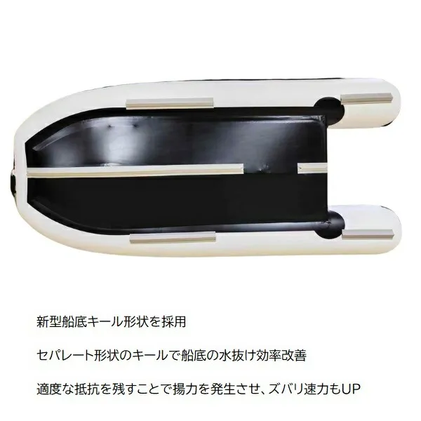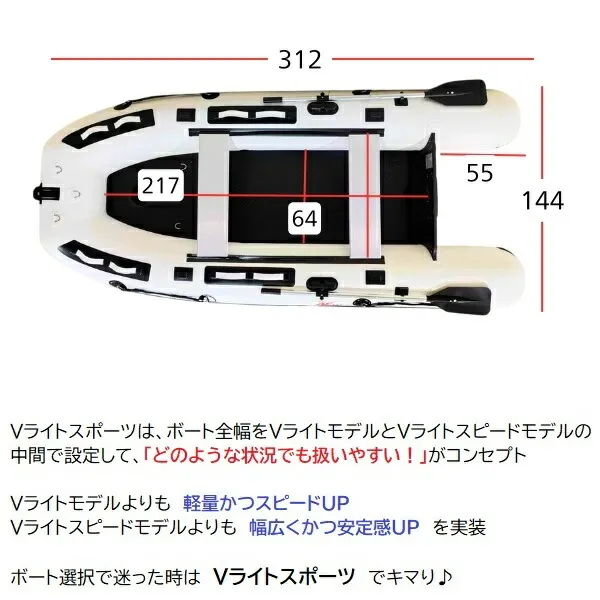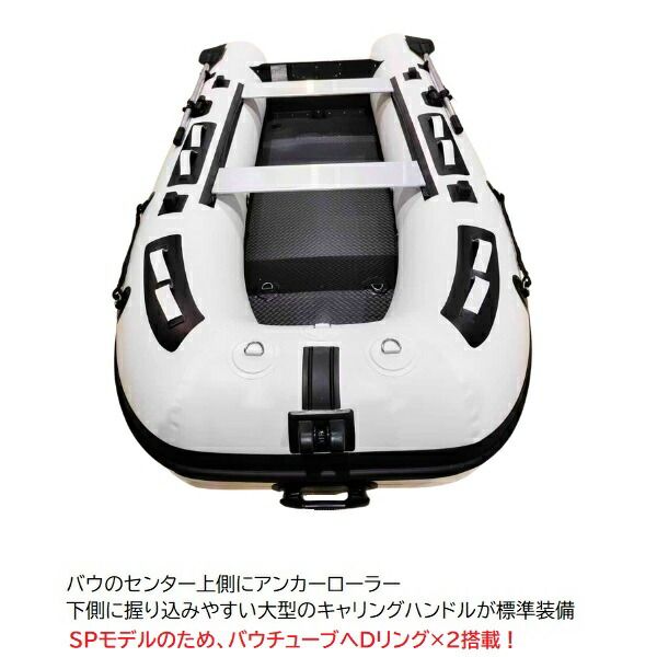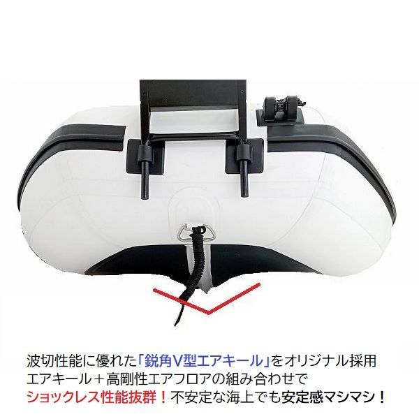 ◆ ☆ゴムボートエントリーに絶対オススメなNEWシリーズ ☆軽さと安定感とスピード すべて取り込み扱いやすさNO.1を実現したアイテム ☆基本構造はVライトシリーズでありながら、最新設計を随所へ投入し大幅にベースアップ ☆センターキールとサイドキールはセパレート構造となり、ボトムの排水スピードがアップし速力も向上 ☆バウセンター上側へアンカーローラーを、下へ大型キャリングハンドルを設置 ☆SP(スペシャル)モデルは、オプション品を一部専用標準装備として充実装備にてご提案 ☆耐久性の高いストラップベルトを6本装備 掴むこともでき、各種艤装にも重宝します ☆ガンネルDリング8箇所+ライフラインを4本装備 ☆高剛性、高圧、軽量な最高級エアフロア採用。滑り防止加工付 ☆エアフロアにタックル等が固定できるDリング装備 ☆様々なアクセサリー対応できるロッドホルダーベースを4箇所に装備