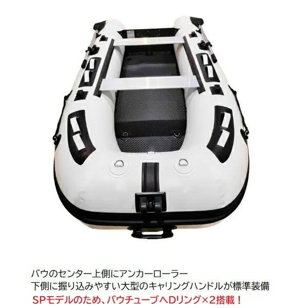 ◆ 2人乗り標準のベストサイズ 場所を選ばす使いやすい310サイズ 男性大人2人使用でもゆとりのあるサイズ感で、使い勝手もピカイチ 安心感の高いエアフロアを装着して、終日の使用でも疲れ知らずの抜群な快適性を確保 バウ側へSPモデル専用のバンジーコードを装備して、クーラーボックス等の大型荷物固定も可能 夏場の高水温期も安心して使える内圧調整バルブを搭載し、内圧の上昇を自動制御してくれます 船底キールは最新設計となり、走行時の快適さは上級モデルに引けをとりません 価格に見合わない豪華設計を盛り込んで、破格で提供いたします!ゴムボートの選択に悩んだらコレ!! ・・・ 弊社紹介