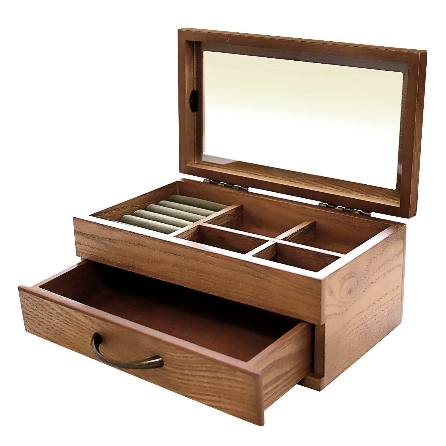 本体サイズ:約W25×D16(取っ手含む)H11cm / 上段リング差し:内寸 約幅7cm / 4マス仕切り部分:1マス 内寸 約W7×D5.5×H2.5cm / 引き出し部分:内寸W21.5×11cm
