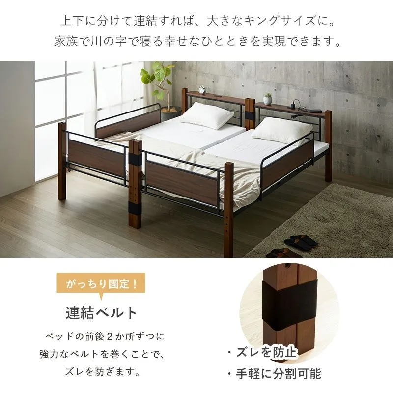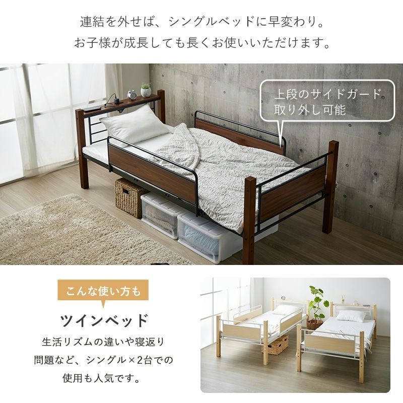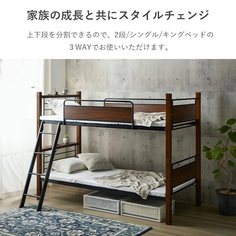 買い替え不要の3WAYベッド IWB-2770-2880 2段ベッド シングルベッド キングベッド 3WAY仕様 天然木 木製 耐荷重250kg 2口コンセント付き アイアン ナチュラル×ホワイト ブラウン×ブラック 【全2色】[7894]