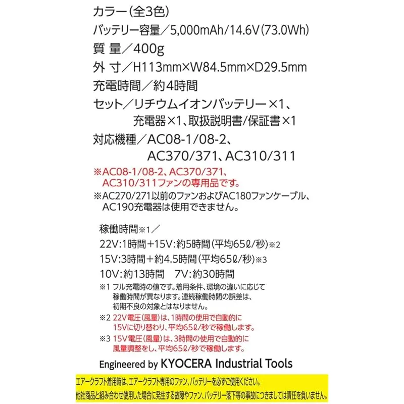 【商品説明】 ・最大毎秒100リットルの風量を1時間発揮するハイスペックバッテリー ・セット:リチウムイオンバッテリー×1・充電器×1・取扱説明書/書×1 ・カラー :78.マットブラック 61.アーミカーキ 72.メタリックゴールド ・バッテリー容量/5,000mAh/14.6V(73.0Wh) ・質 量/400g ・外 寸/H113mm×W84.5mm×D29.5mm ・充電時間/約4時間 ・対応機種/AC08-1/AC08-2、AC370/371、AC310/311 AC270/271以前のファンおよびAC180ファンケーブル、AC190充電器は使用できません 稼働時間1 22V : 1時間+15V:約5時間(平均65リットル/秒)2 15V : 3時間+約4.5時間(平均60リットル/秒)3 10V : 約13時間 7V : 約30時間 1 フル充電時の値です着用条件、環境の違いに応じて稼働時間が異なります連続稼働時間の誤差は、初期不良の対象とはなりません 2 22V電圧(風量)は、1時間の使用で自動的に15Vに切り替わり平均65リットル/秒で稼働します 3 15V電圧(風量)は、3時間の使用で自動的に風量調整をし平均65リットル/秒で稼働します Engineered by KYOCERA Industrial Tools