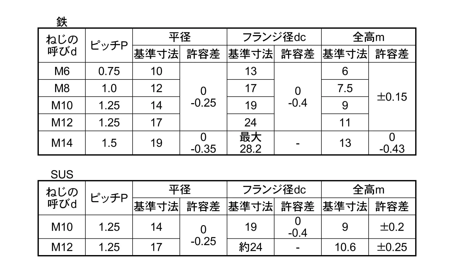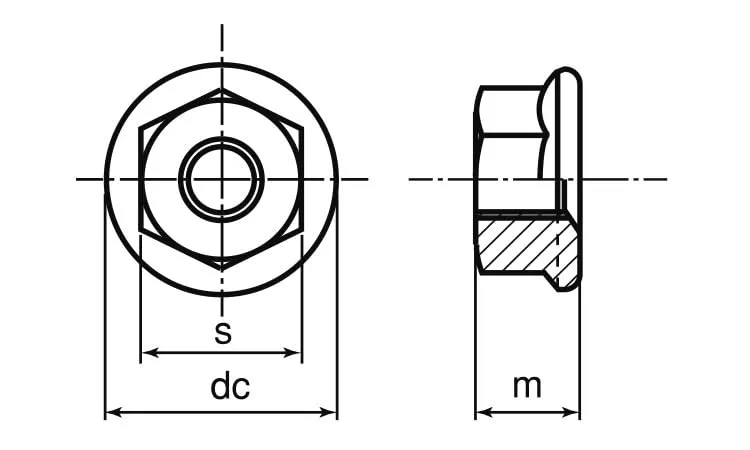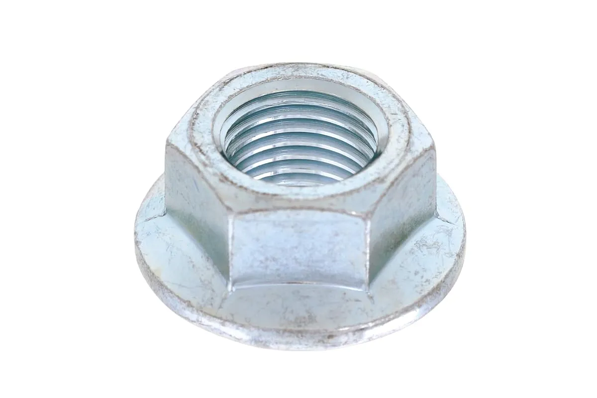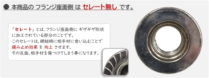 ■形状 : フランジ付き六角ナット 六角ナットの片面に、二面幅より大きい座面が付いたナット。 座面が大きい分締め付け強度が増し、緩み止め効果が発生する。 スパナ、レンチなどの工具を使用して締め付けます。