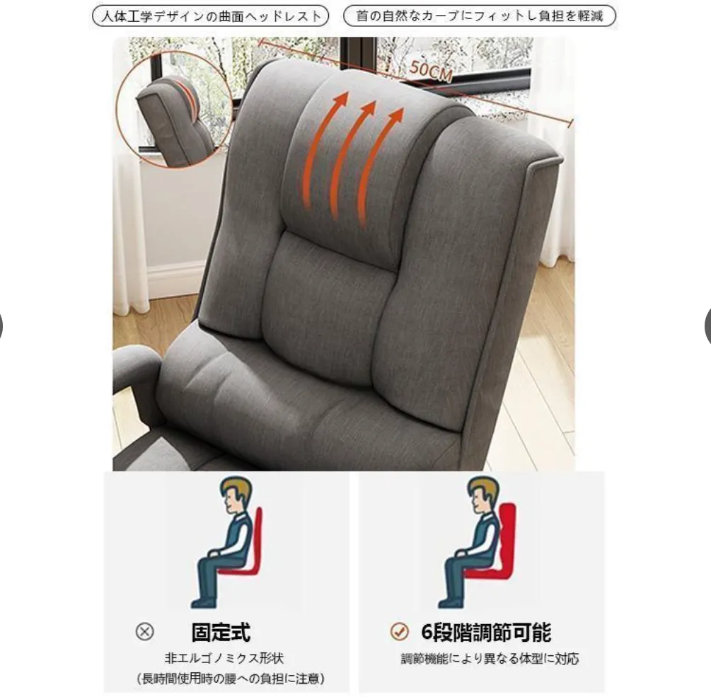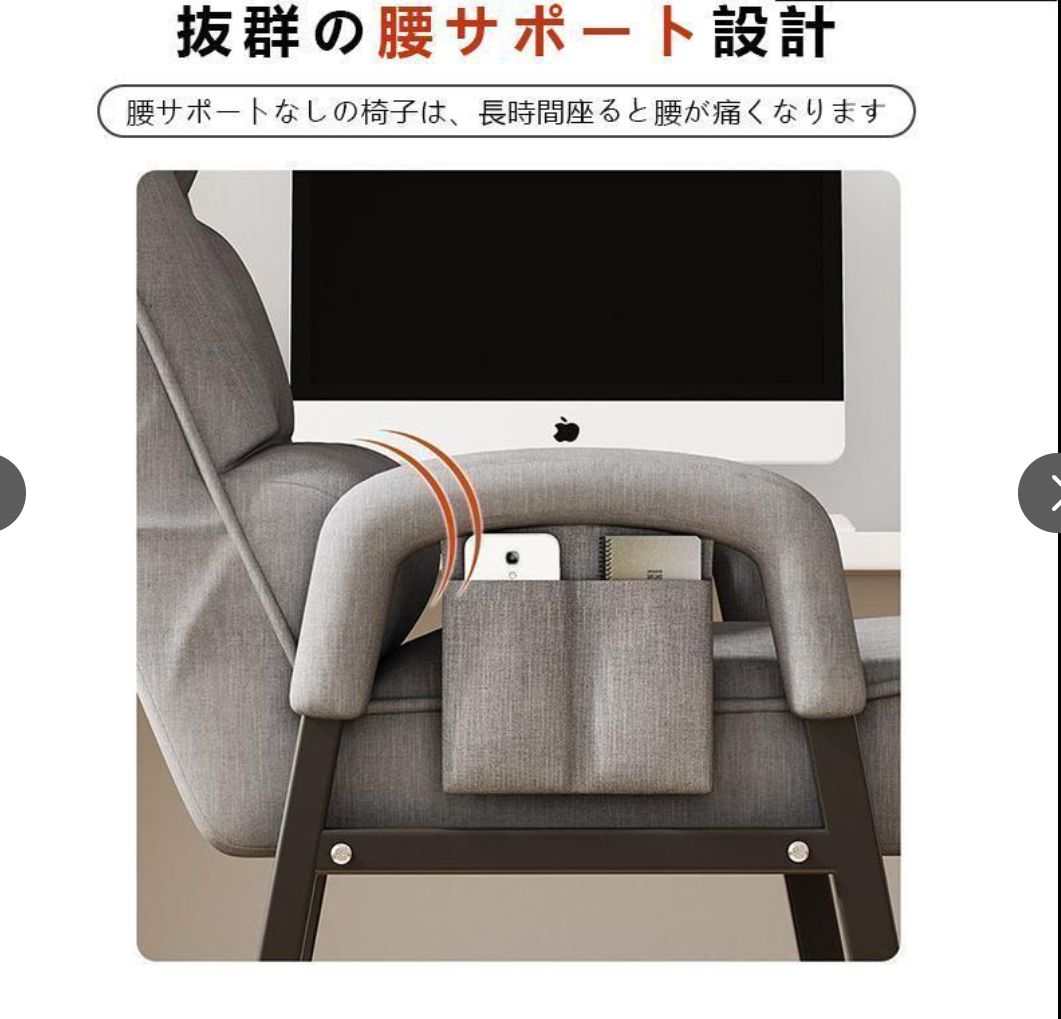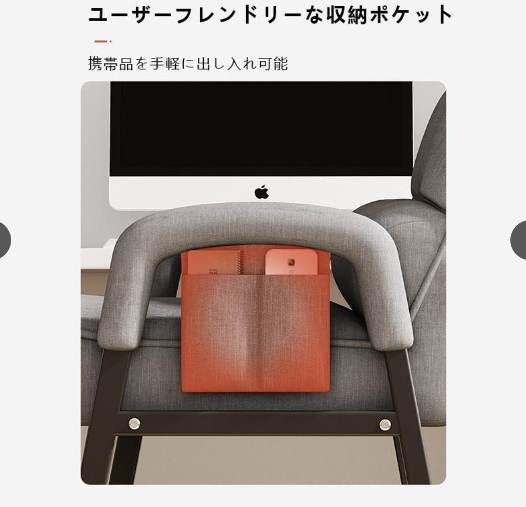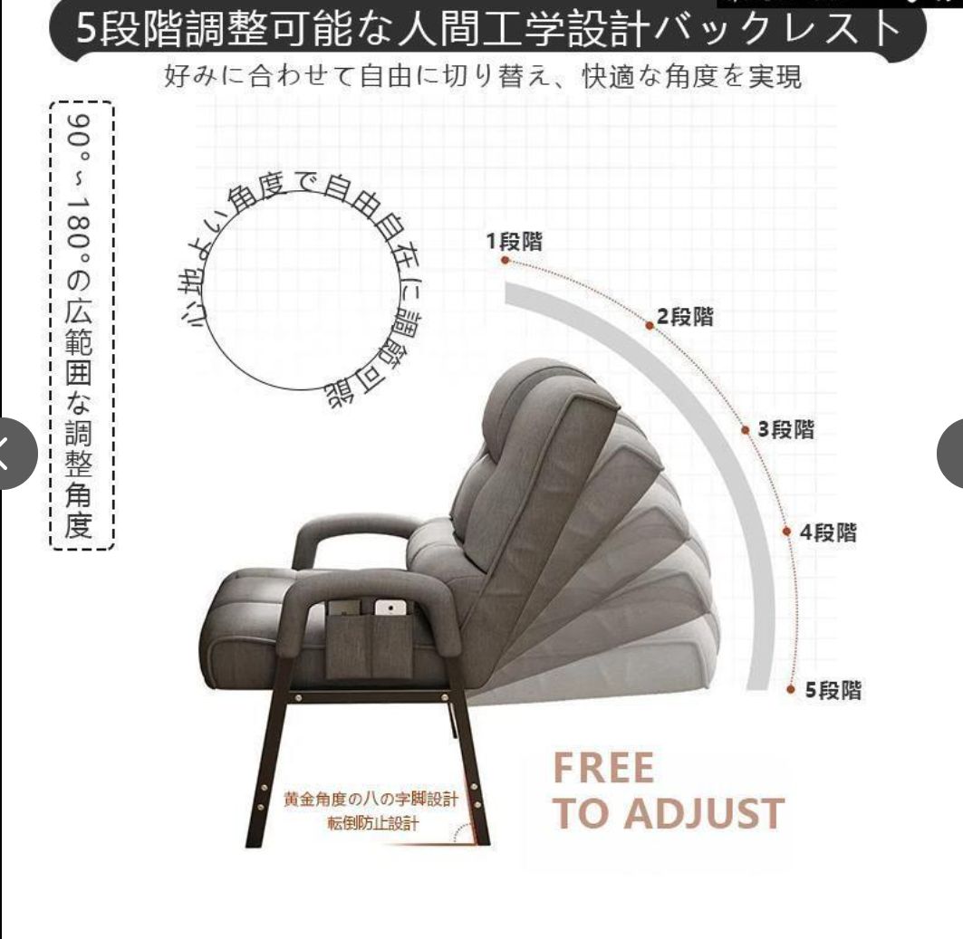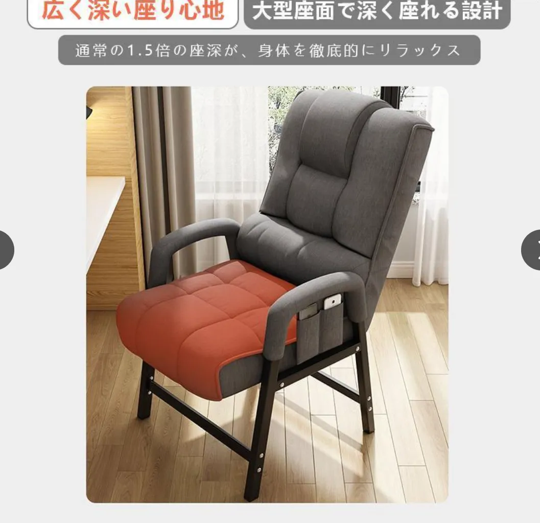 【折りたたみ可能】背部は折りたたむことができます。使わないときはコンパクトに収納が可能です。 背部リクライニング(5段階) 背もたれは5段階でリクライニングできるので、お好みの姿勢でくつろげます。 肘掛け付きで立ち座りをサポート 立ちあがるときに手を置く部分のアーム幅が約1.5cmと、少し細くなっているので、しっかりと握って力をいれやすいです。 快適な座り心地