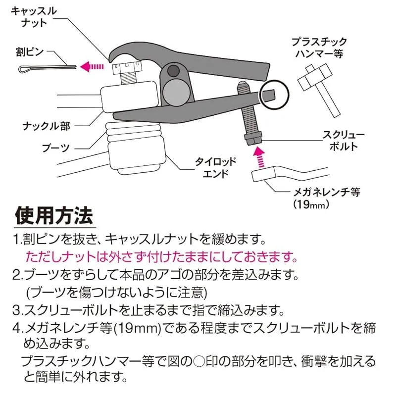 【商品説明】 タイロッドエンドセパレーターはブーツに傷付けずにタイロッドエンドを取り外すことができる特殊工具です。長さに合わせて開口幅を2タイプに設定できます。[ボルト挿入幅] 19mm[リフティング量] 40mm[全長] 165mm[重量] 1.1kg[材質] クロームモリブデン鋼[注意] ▲インパクトレンチは使用できません。