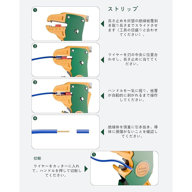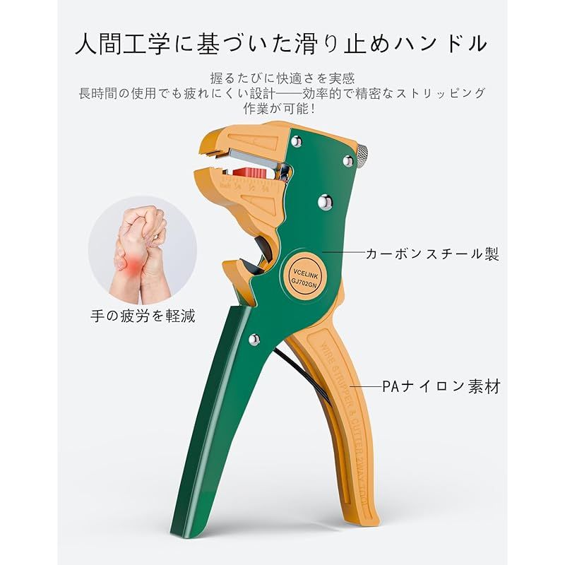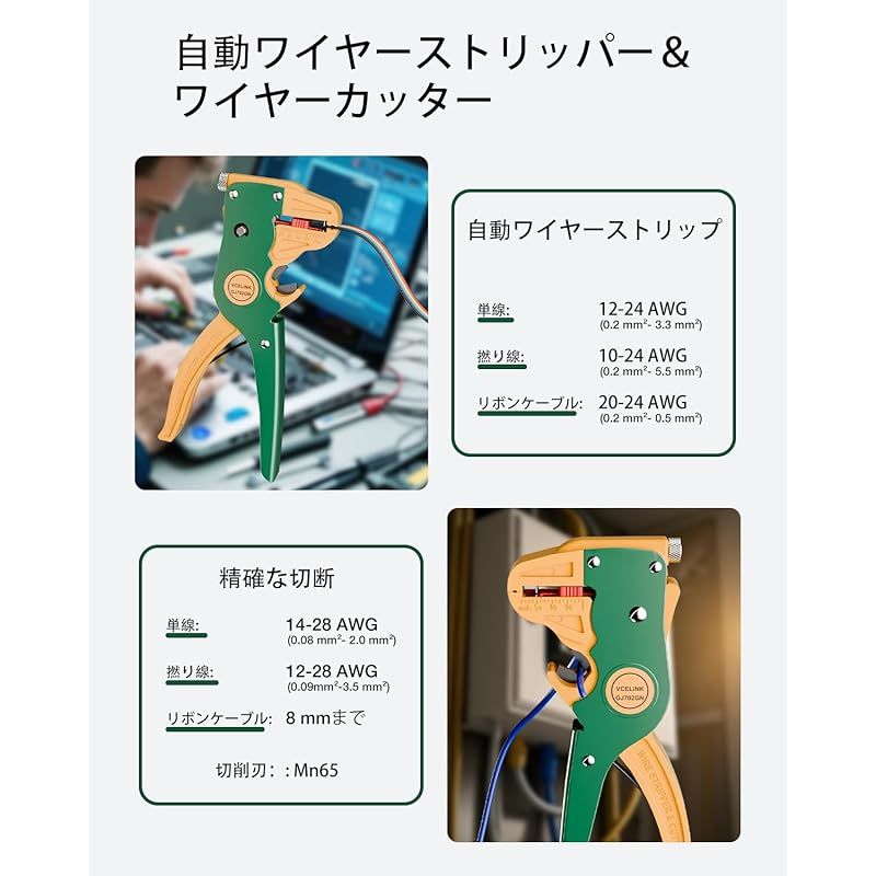 【迅速】VCELINK GJ702 自動ワイヤーストリッパー & カッター 10?24 AWG(0.2mm2-5.5mm2) 被覆剥き ワイヤー切断 寸法調整可能 高精度 単線 撚り線用 緑 製造元:VCELINK 商品番号:GJ702-BK/GN-DE 色:緑