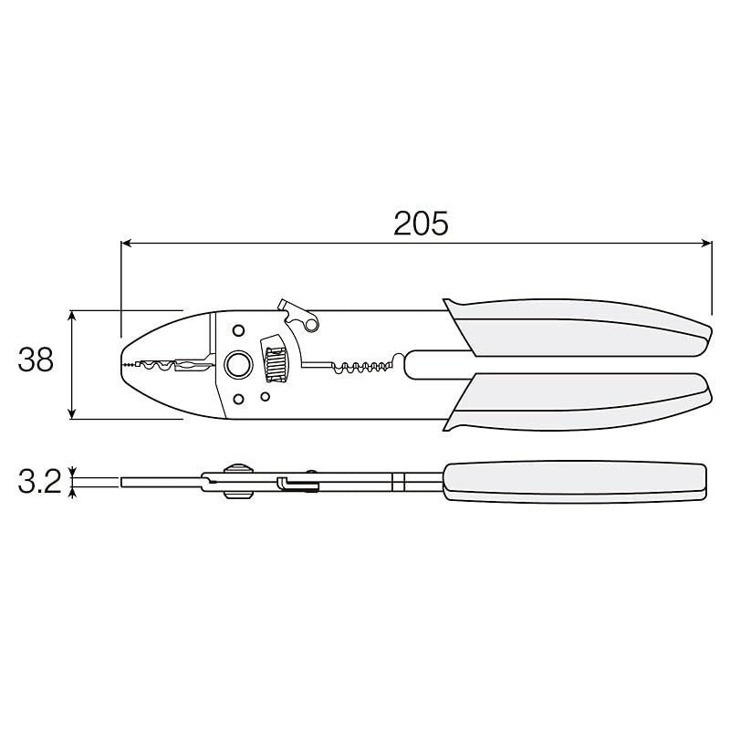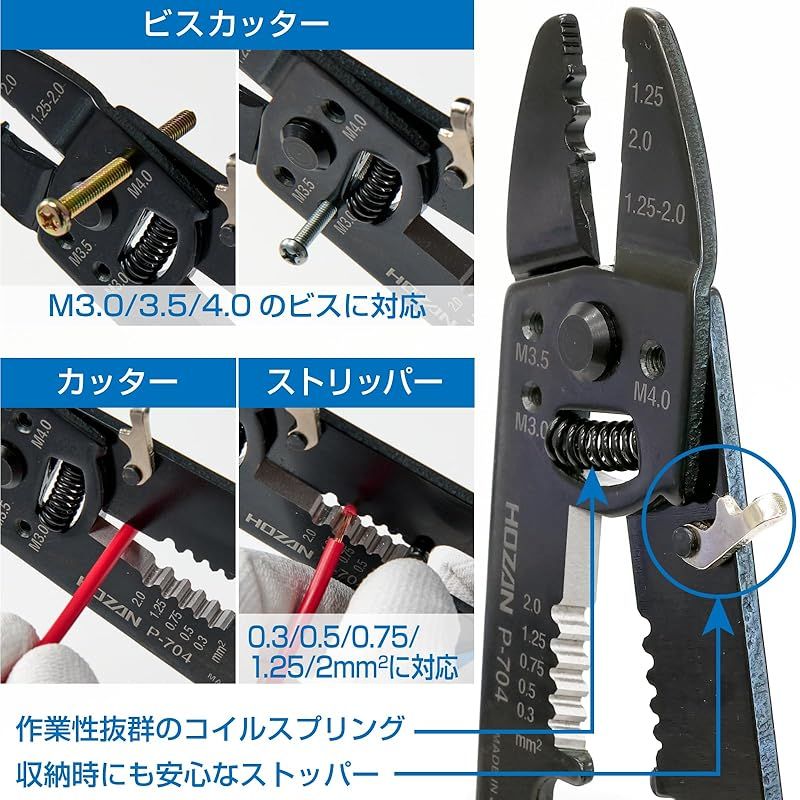 【商品概要】 3種の端子を圧着可能。裸圧着端子・絶縁被覆付圧着端子:1.25/2に対応。絶縁閉端子:CE1/2に対応。 カッター・ビスカッター付き。M3.0/3.5/4.0のビスに対応。 高精度研磨加工のワイヤーストリッパー付き。0.3/0.5/0.75/1.25/2mm^2に対応。 収納時にも安心なストッパー付き。連続作業にも疲れを感じさせないコイルバネを装備。 握りやすく、滑りにくいエラストマーグリップを採用。長時間の作業でも疲れを感じさせません。さらに、環境にも配慮したRoHS対応。