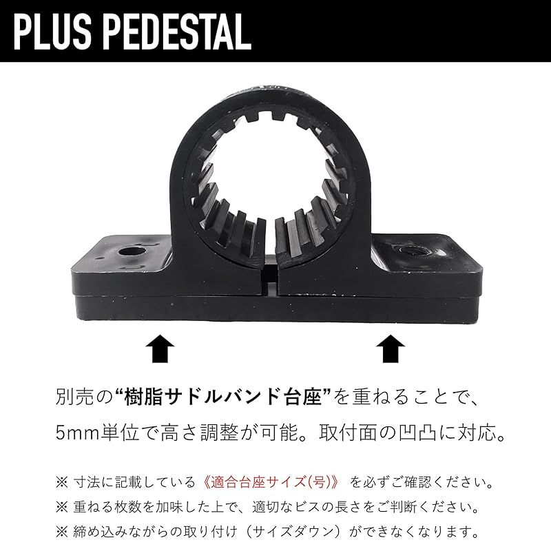 ●樹脂サドルバンド台座(別売)を組み合わせて、5mmずつ取付の高さを調整できます。 <注意事項>