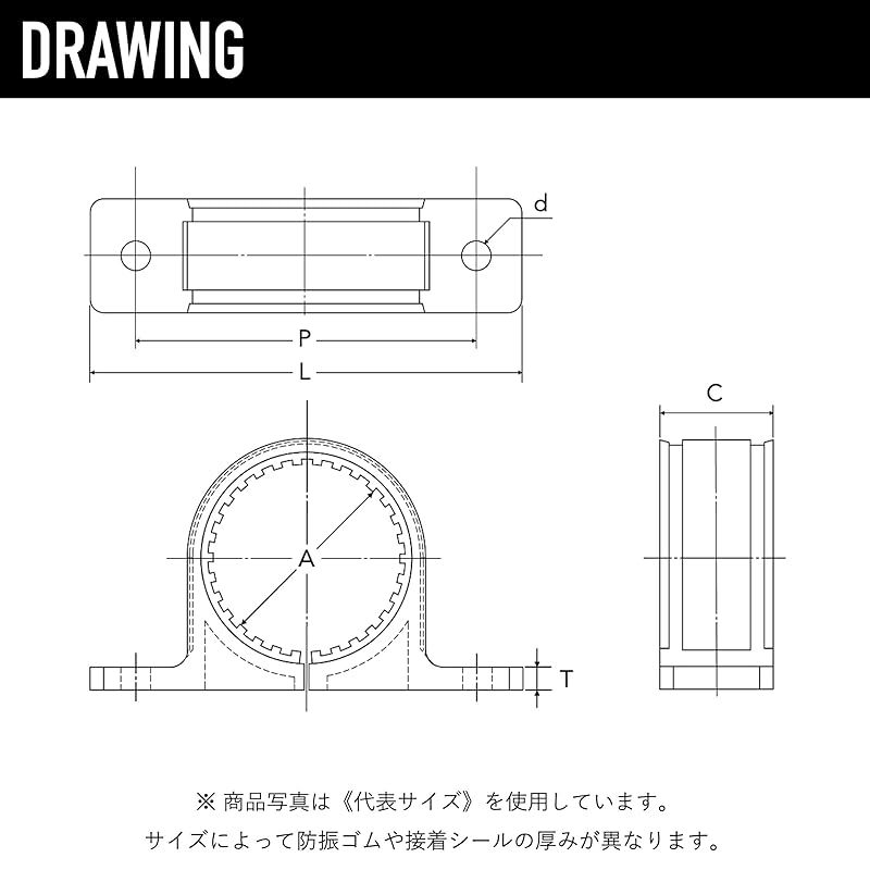 【商品寸法】A:32mm|C:25mm|L:90mm|P:70mm|T:5mm|d:6mm|適合台座サイズ:4号 (注)パイプの呼び径(A)とは異なります。外径(直径)に合わせて適切なサイズをご選択ください。