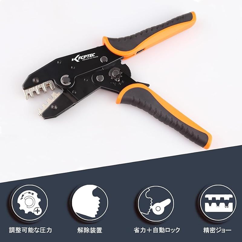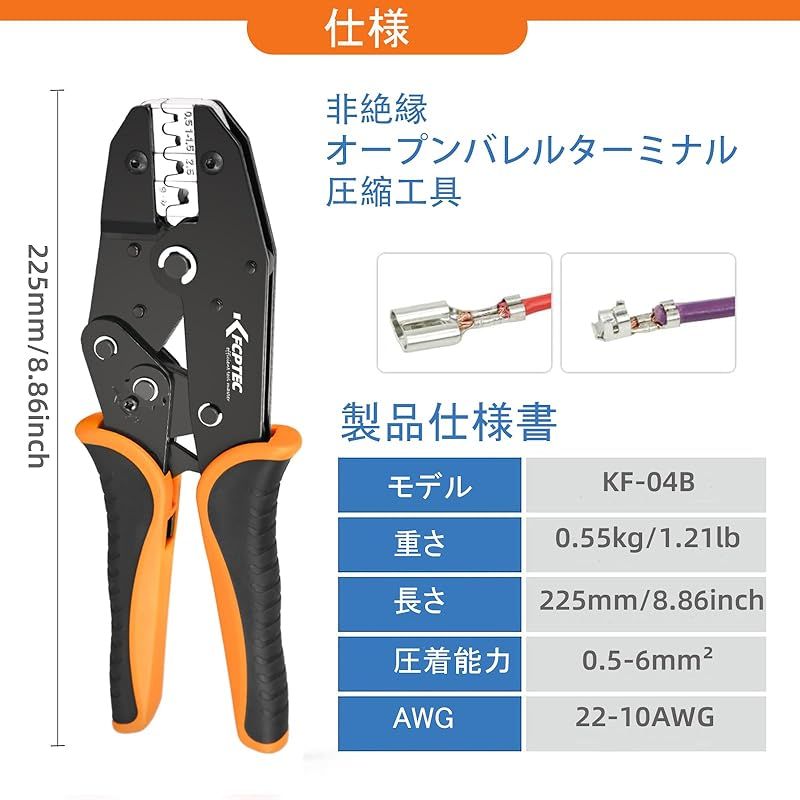 【迅速】KF CPTEC 04B ラチェット式圧着ペンチ 非絶縁オープンバレル端子用 ? JST、Molex、TE、AMP、Deutsch コネクタ対応 ? AWG 22-10 (0.5?6.0mm2) 調整可能ワイヤクリンパー 製造元:KF CPTEC 商品番号:KF-04B
