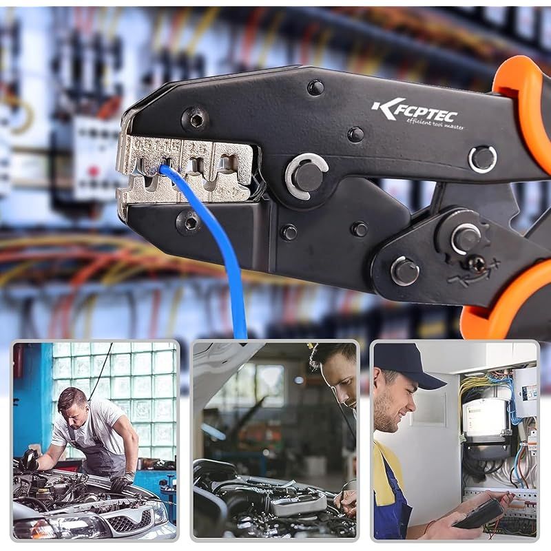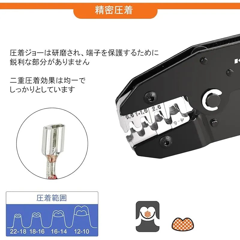 【正確で信頼性の高い精密圧着ペンチ】非絶縁オープンバレル端子(AWG 22-10 / 0.5?6.0mm2)に対応し、精密加工されたニッケルクロム合金製の圧着ジョーを採用。硬度38HRCに強化され、表面は滑らかで耐摩耗性・防錆性に優れ、長期間にわたり高い精度を維持します。Deutsch、JST、TE、AMP、Molexなどの各種コネクタ(スリーブ端子、丸型端子、平型端子)に対応。