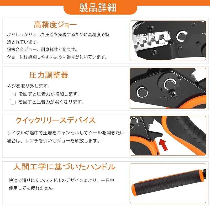 【調整可能な圧着設定】内蔵のスター型調整ホイールにより圧着力を正確にコントロールでき、過剰圧着や緩みを防止。さまざまな線径や端子タイプに適応可能です。