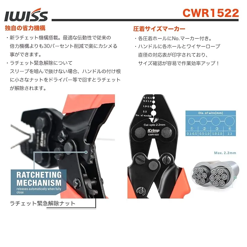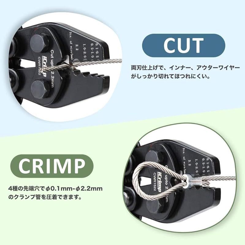 【迅速発送】アイクリンプ(iCrimp) ラチェット式 ハンドプレッサー アルミスリーブ かしめ機 ワイヤークランプカッター 圧着 切断 1丁2役! φ0.1mm-φ2.2mm対応 CWR1522 0