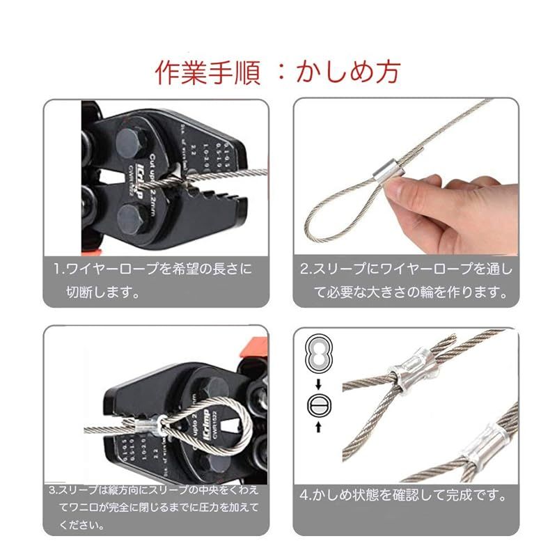 【商品概要】 全長:175mm、 重さ:270g 圧着能力(ワイヤー径):φ0.1?0.5mm、φ0.5?1.0mm、φ1.0?2.0mm、φ2.2mm 仕様:ラチェット省力機構、トグル機構、防錆塗装処理 特徴:特殊ラチェット機構とテコの力で、より一層強力・確実に圧着します。ワイヤーロープカッター機能付き(φ2.2mm)。 適合:8文字型、丸型、楕円型アルミスリープ(もしくは銅製スリープ、クランプ管) ※新品の場合、圧着工具(新品)のハンドル動作(リングやピン)がかたいことは正常です。しばらくお使いいただくことで少しずつなじみ、軽くなります。