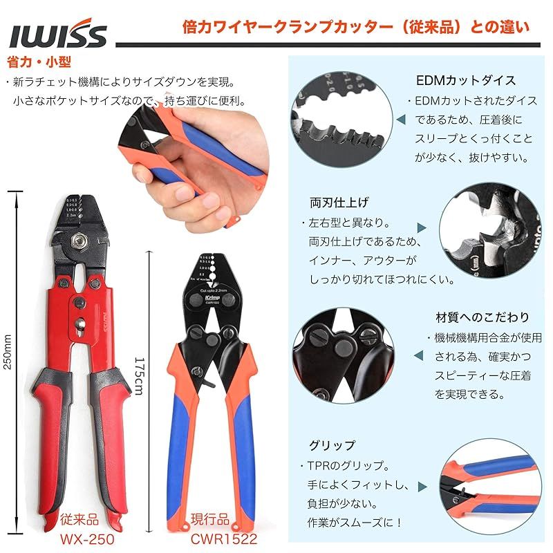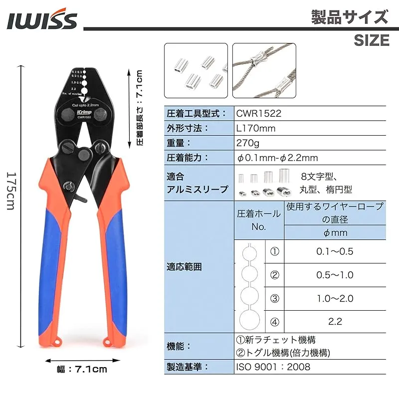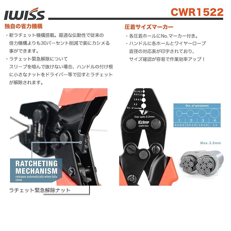 【迅速】アイクリンプ(iCrimp) ラチェット式 ハンドプレッサー アルミスリーブ かしめ機 ワイヤークランプカッター 圧着 切断 1丁2役! φ0.1mm-φ2.2mm対応 CWR1522 製造元:IWISS 商品番号:CWR-1328 色:混合カラー