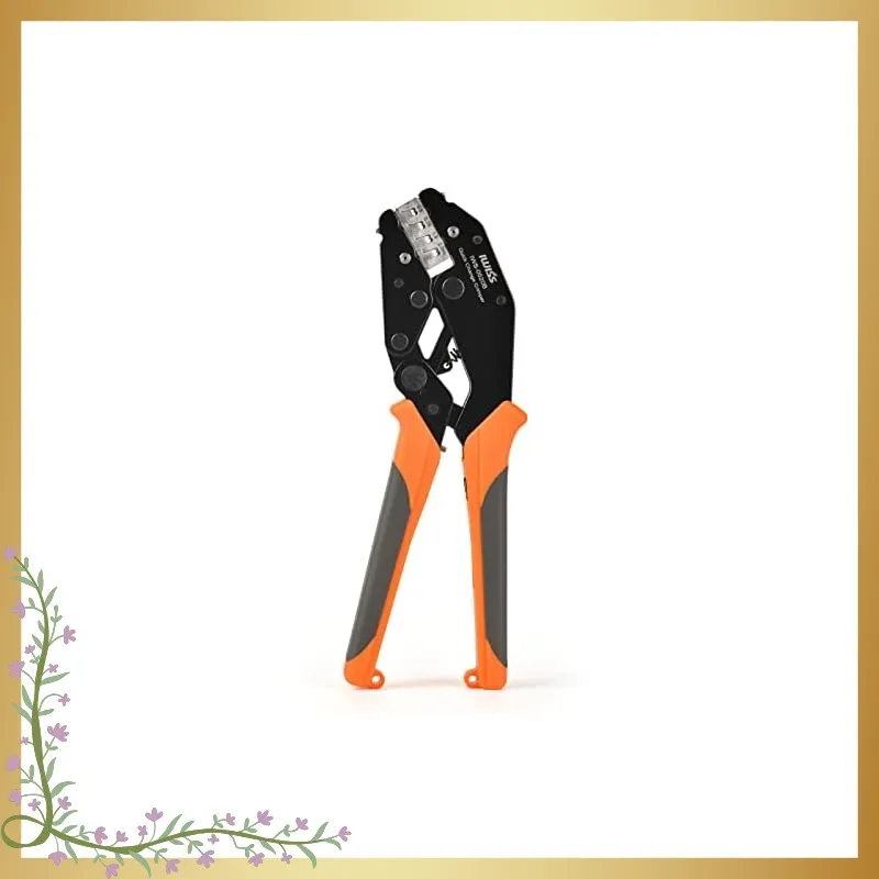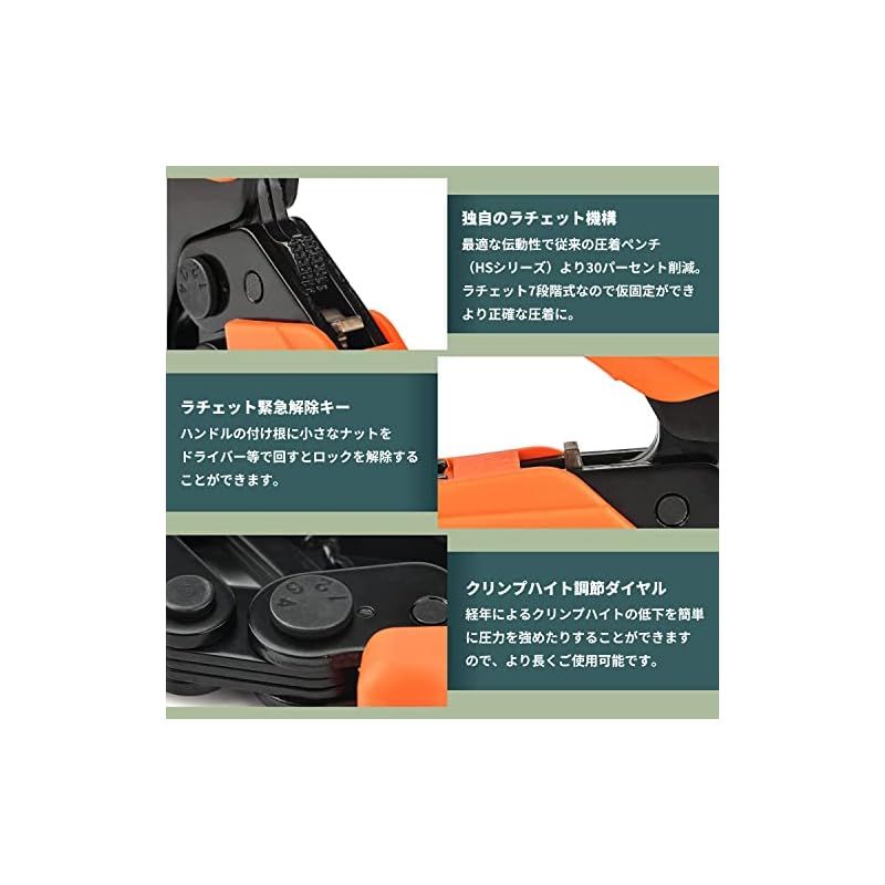 【商品概要】 全長:230mm; 重量:600g 圧着能力:AWG24-14 (0.5-2.0mm^2) 用途: エーモン社丸型ギボシ端子、平型ギボシ端子#250・#187、ダイナミックコネクタD-3000シリーズD-3コンタクト2L・3Lに対応 圧着ダイス(4サイズ):0.5sq、0.75sq、1.5sq、2.0sq 特徴:芯線と被覆同時圧着、国際規格 DIN IEC 60352-2準拠品、ラチェット機構・ラチェット緊急解除