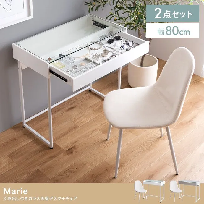 【送料無料】【2点セット】Marie 幅80cm 引き出し付きガラス天板デスク+チェア