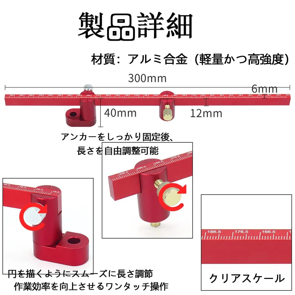 【素材】耐久性のあるアルミニウム合金製で、防錆性とスムーズな操作のためにCNC陽極酸化レッド仕上げでコーティングされています。木工プロジェクトの長期にわたる耐久性と精度の向上を約束する信頼できるツールです。