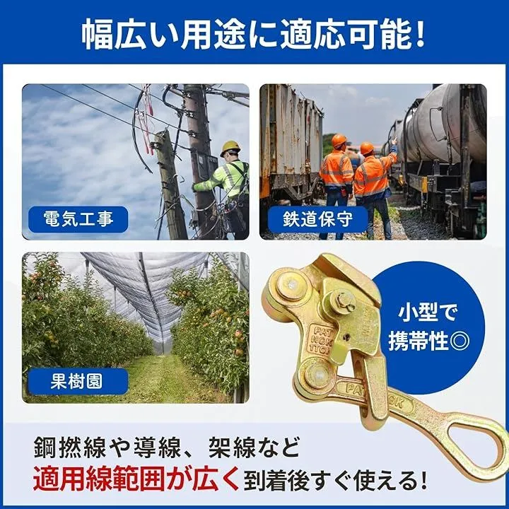 張線器(シメラー)の補助具としても活用でき、電設作業、配線通し、鉄道保守、果樹園での作業など、多岐にわたる用途に対応します。