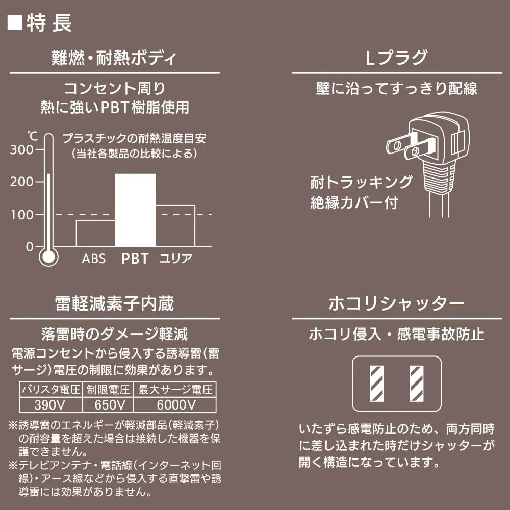 ◆コンセント周りに熱に強いPBT樹脂を使用した難燃・耐熱ボディ