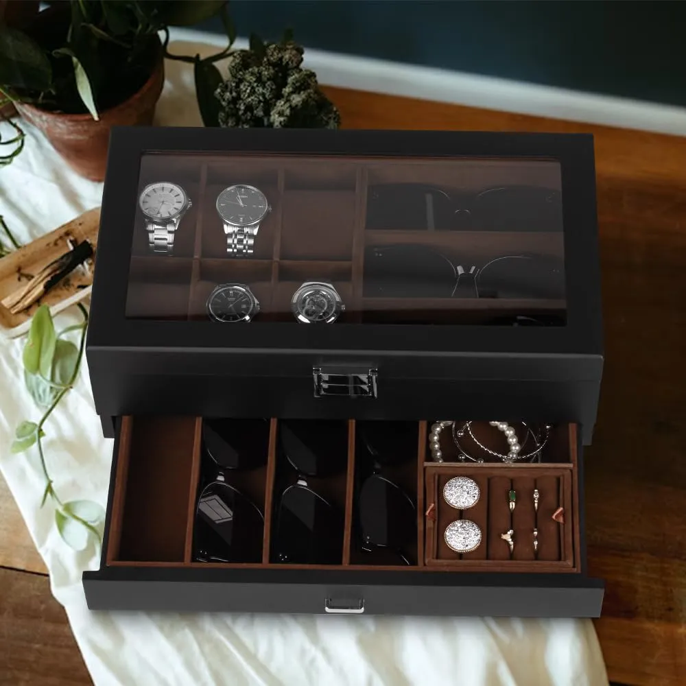 【数量限定】アクセサリー・指輪・ブレスレット収納可能 サングラス7本 コレクションケース 腕時計6本 腕時計・眼鏡・ジュエリー収納ボックス (腕時計6本・メガネ7本) 高級2層木製時計ケース Baskiss