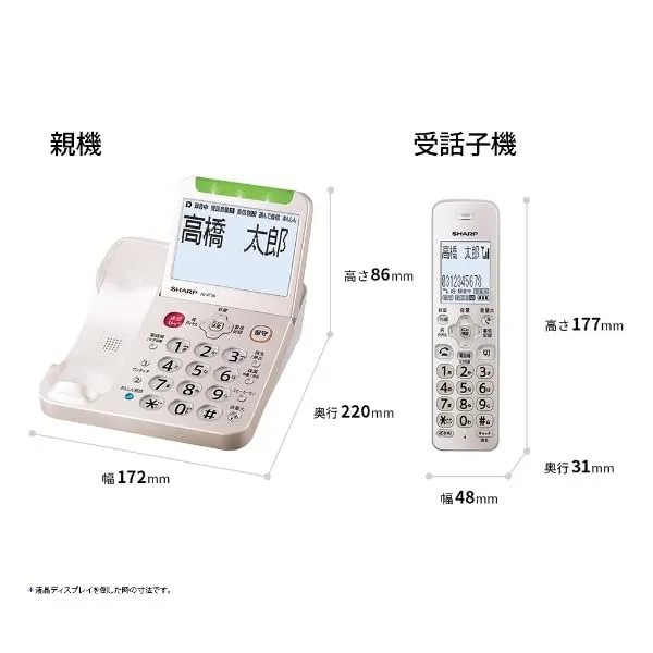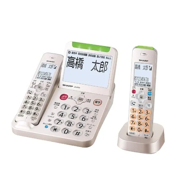 「商品状態」11「商品情報 (新品の場合) 」親機の受話器もコードレスだから、話しながら部屋を移動したり、そのまま手渡して取り次げます。コードレス子機と同じような使い方ができます。大きくて見やすい「漢字液晶」。あやしい電話からしっかりガードする「防犯機能」が設定済み。着信音が鳴る前に警告するので、気づかないうちに迷惑電話を撃退できます。また警告されても電話を切らない相手には、名前を確認する自動メッセージを流すので、相手を確認してから電話に出るか判断できます。シャープの電話機なら、2重の対策で迷惑電話をしっかり防ぎます。電話をかけてきた相手を着信ランプの色でお知らせします。本体メモリーに、たっぷり120分(1件10分まで、最大100件)録音できます。もしメモリーがいっぱいになっても、古い録音から自動的に上書きされるので、録音できなくなることはありません。着信中や通話中、留守応答中でもボタンを押すだけで、メッセージを流し、電話を切ります。スピーカーを通して相手の声を聞くことが詐欺対策に有効とされています。あやしい電話を受けた後は、家族や警察署などあらかじめ登録した信頼できる相手へワンタッチで電話して相談できます。 「主な仕様」着信(呼出)音量切替:6段階・切