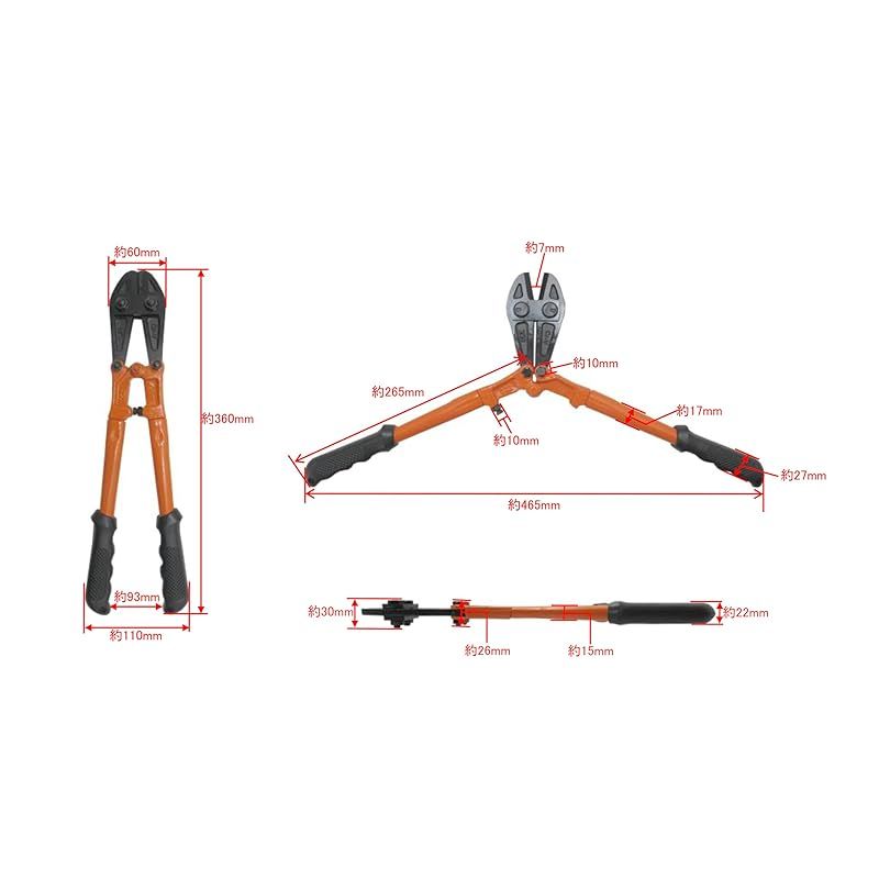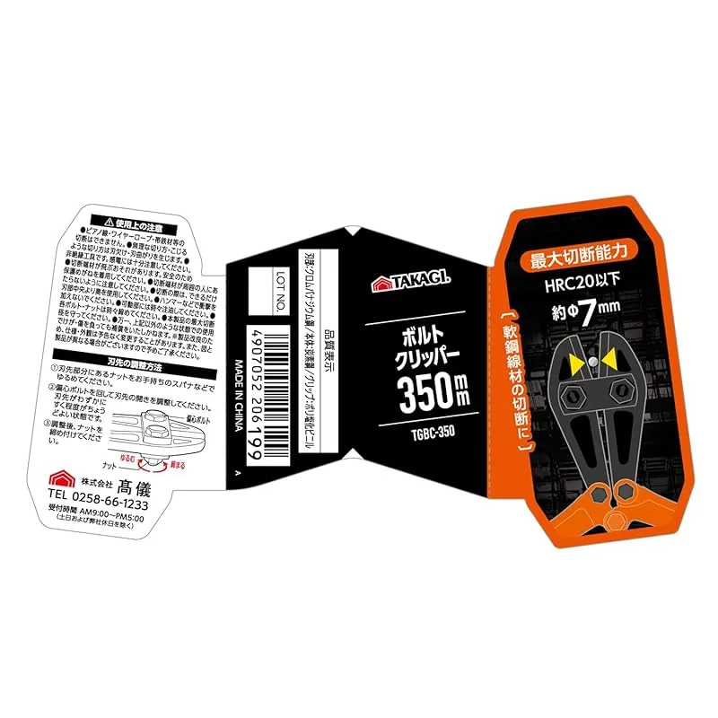 【迅速】高儀(Takagi) ボルトクリッパー 番線カッター ボルトカッター 鉄筋カッター ワイヤーカッター 350mm 軟鋼線材 鉄線 針金 切断 工具 刃先の開き 調整可能 TGBC-350 製造元:儀(Takagi) 商品番号:TKG-1118490 商品タイプ:350mm(切断能力:軟鋼線約φ7mm)