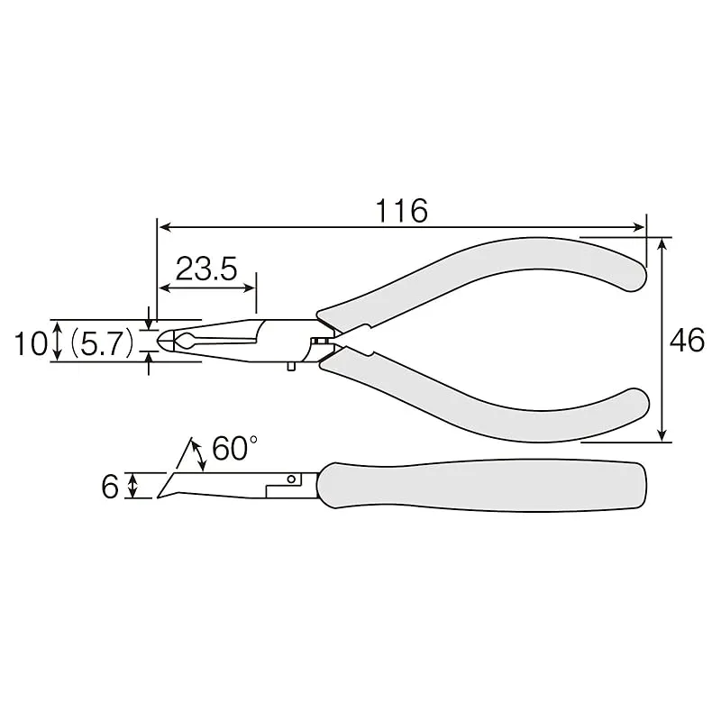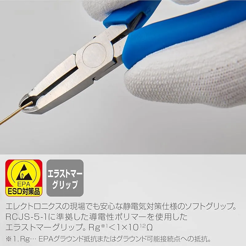 【商品概要】 奥まった個所での切断に適したニッパー(斜めタイプ)。狭いスペースでも効果的な切断が可能。 切断能力は銅線1.0mmφ、銅より線0.9mm^2。 切れ味がよく、連続作業においても疲れを感じさせないコイルバネ装備。また、安全な作業にも配慮し、ケガを防ぐための面取り加工も施されています。 45gの軽量設計で、長時間の作業でも疲れを感じさせません。 静電気対策仕様(ESD管理値:Rg<1×10^12Ω)のエラストマーグリップを採用。握りやすく、滑りにくいグリップです。さらに、環境にも配慮したRoHS対応。 基板や部品を傷つけずに、面一にカットできます。幅広い用途に対応します。 全長116mm、重量45gのコンパクトなボディ。プロの技術者からDIY愛好家にとっても欠かせないツールです。