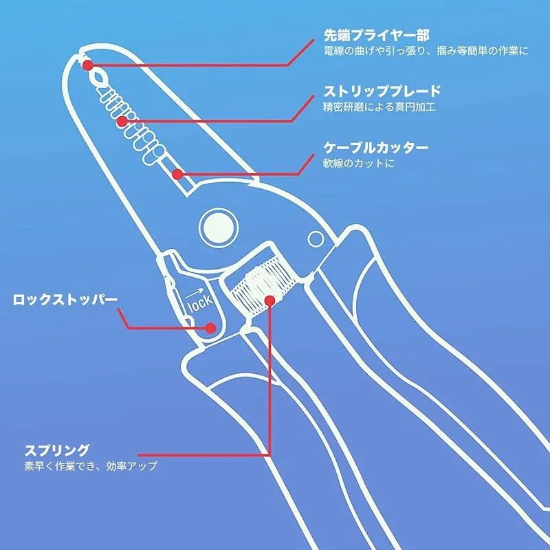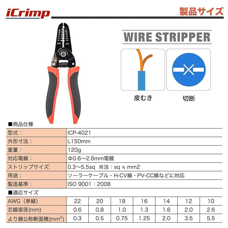 【商品概要】 全長:150mm; 重量:125g 参考適用電線サイズ(単線):0.6、0.8、1.0、1.3、1.6、2.0、2.6mm 参考適用電線サイズ (単線): AWG 22、20、18、16、14、12、10 参考適用電線導体断面積(より線) : 0.3、0.5、0.75、1.25、2.0、3.5、5.5m 特徴:精密研磨による真円加工でシャープな切れ味で高精度な電線被覆の剥離作業が可能