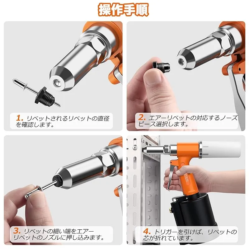 【高品質】良好な硬度、強い耐摩耗性、1408KGFの引張り圧力、ステンレス鋼の釘に使用することができます。16mmの作業ストロークで異なる長さのリベットに対応します。滑りにくく、変形しにくいです。サイレンサーと排気口を内蔵し、作業時に発生する騒音を効果的に低減します。