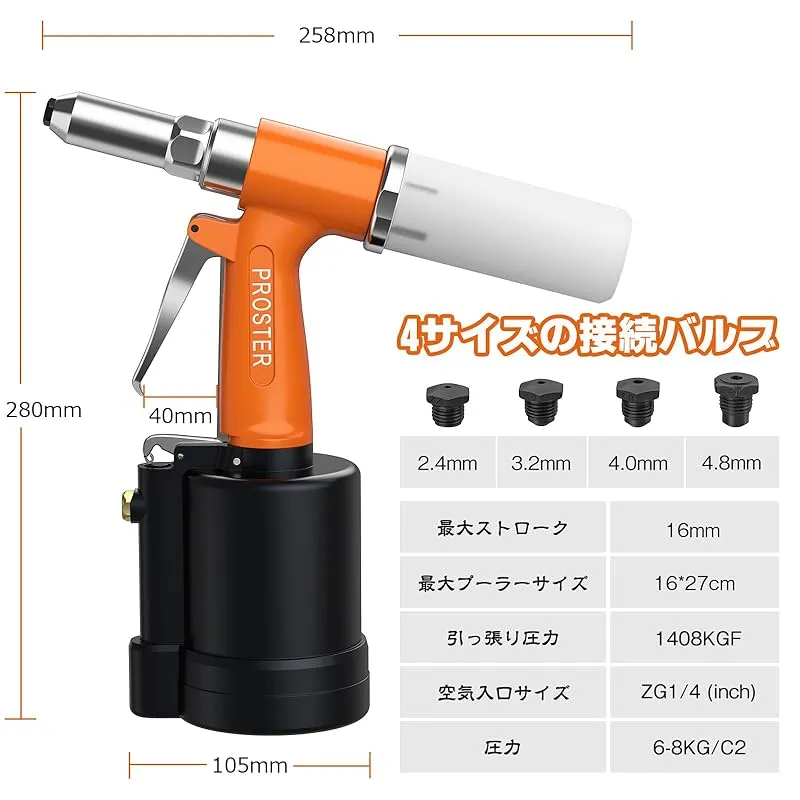 【迅速】Proster エアーリベッター 空気圧リベットガン 2.4/3.2/4.0/4.8mm ノーズピース対応 1408KGF引張り圧力 DIY/装飾産業/自動車製造/容器製造などに適用 製造元:Proster 商品番号:PST281