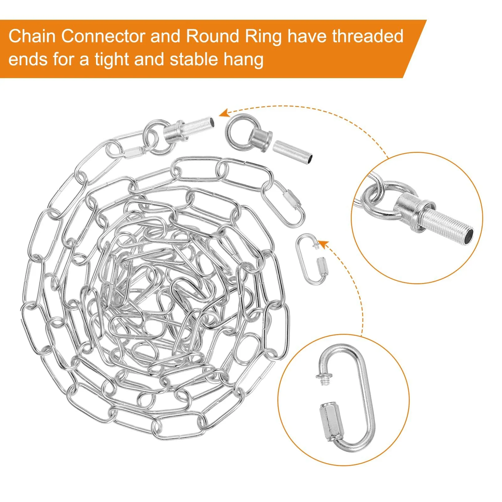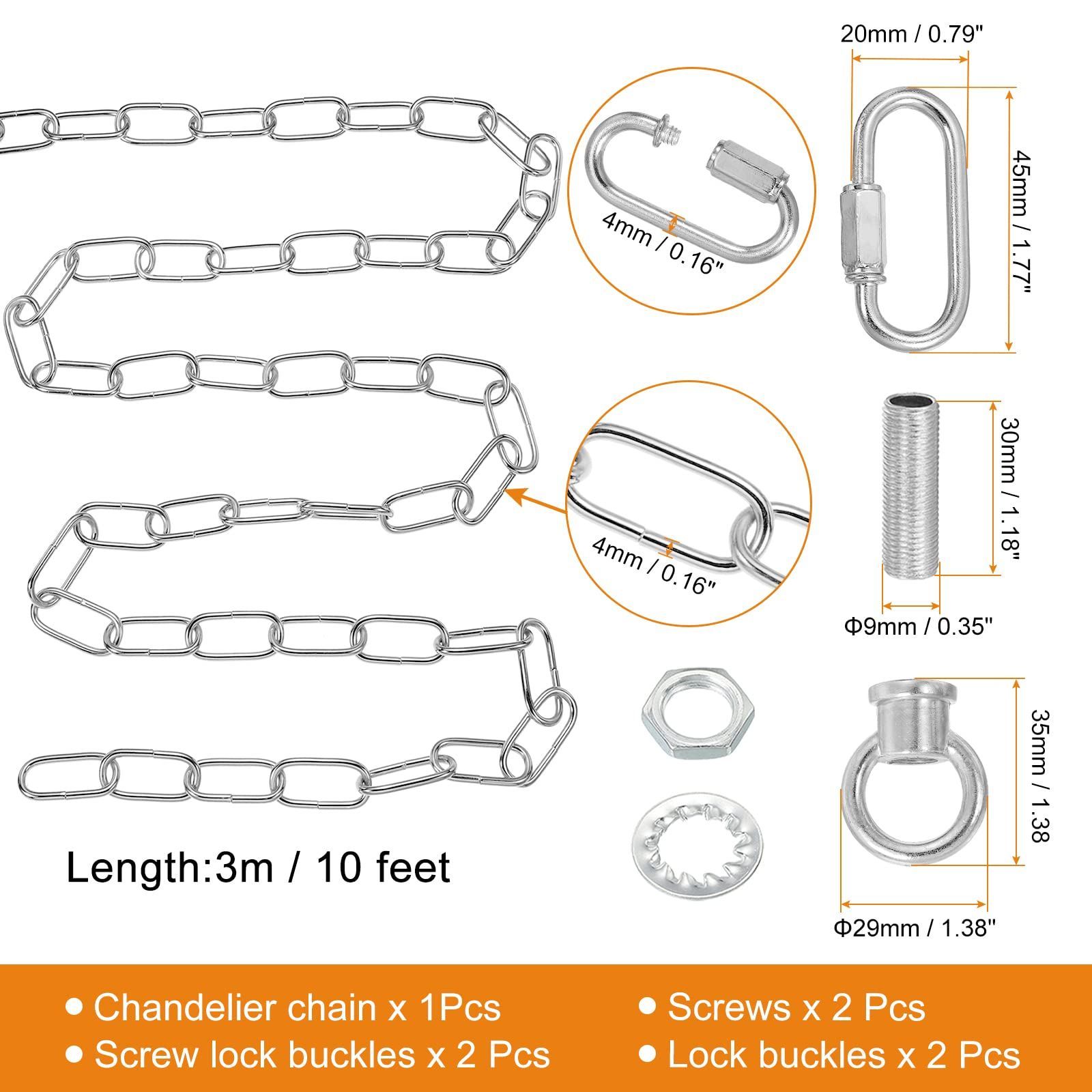 当社のパッケージには、シャンデリアチェーン、調節可能なロックバックル2個、ネジロックバックル2個、照明器具に取り付けまたは接続するためのネジ2個が含まれています。(注意:購入前にチェーンの最大荷重と長さをご確認ください。登山プロジェクトには適していません。)