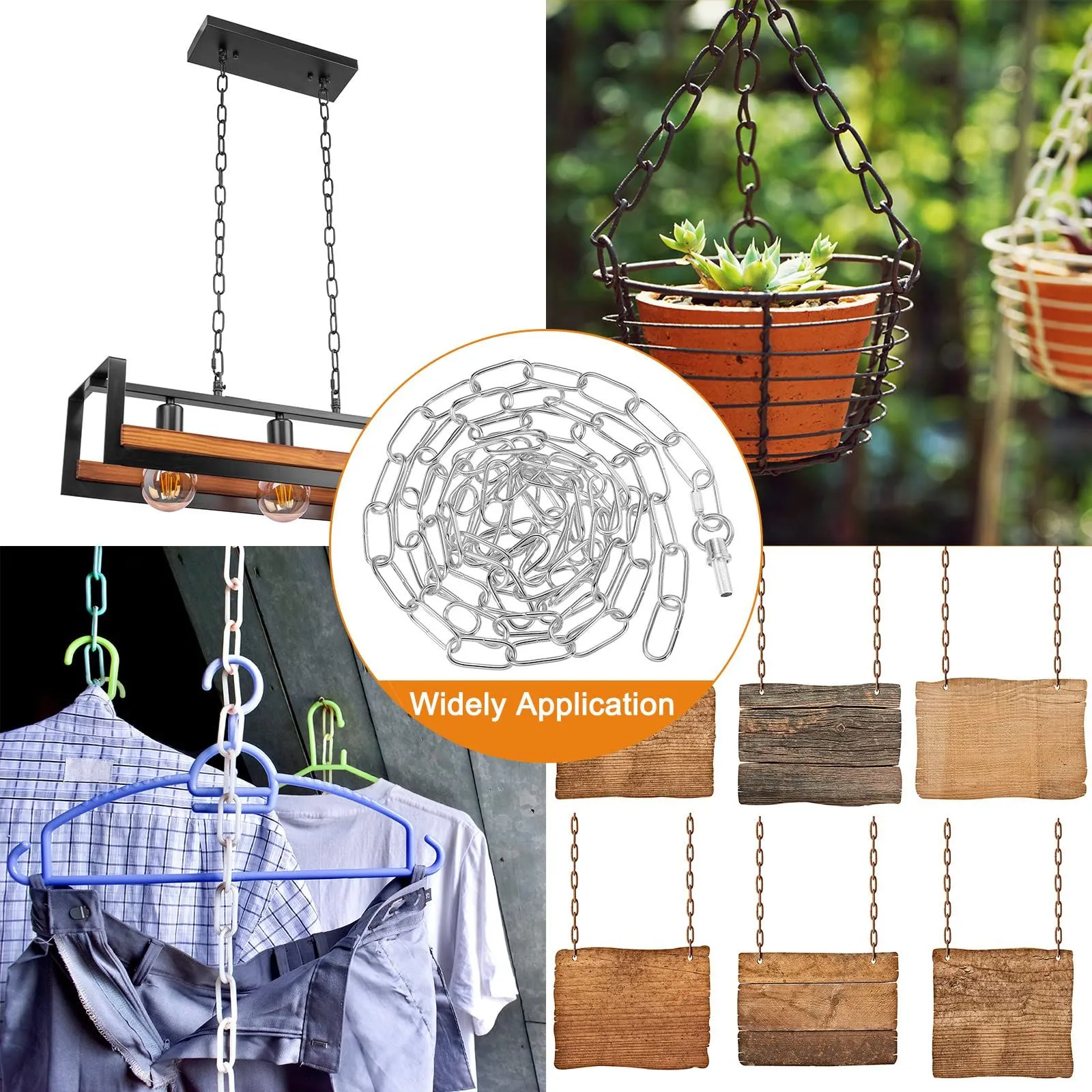 当社の吊り下げチェーンは、パティオやその他の場所に物を吊り下げたり保持したりするために広く使用されています。吊り下げペンダントライト、シャンデリア、玄関ライト、パティオランプ、花かご、植木鉢、瓶、看板、ランタン、風鈴、鳥かごなどに広く使用されています。