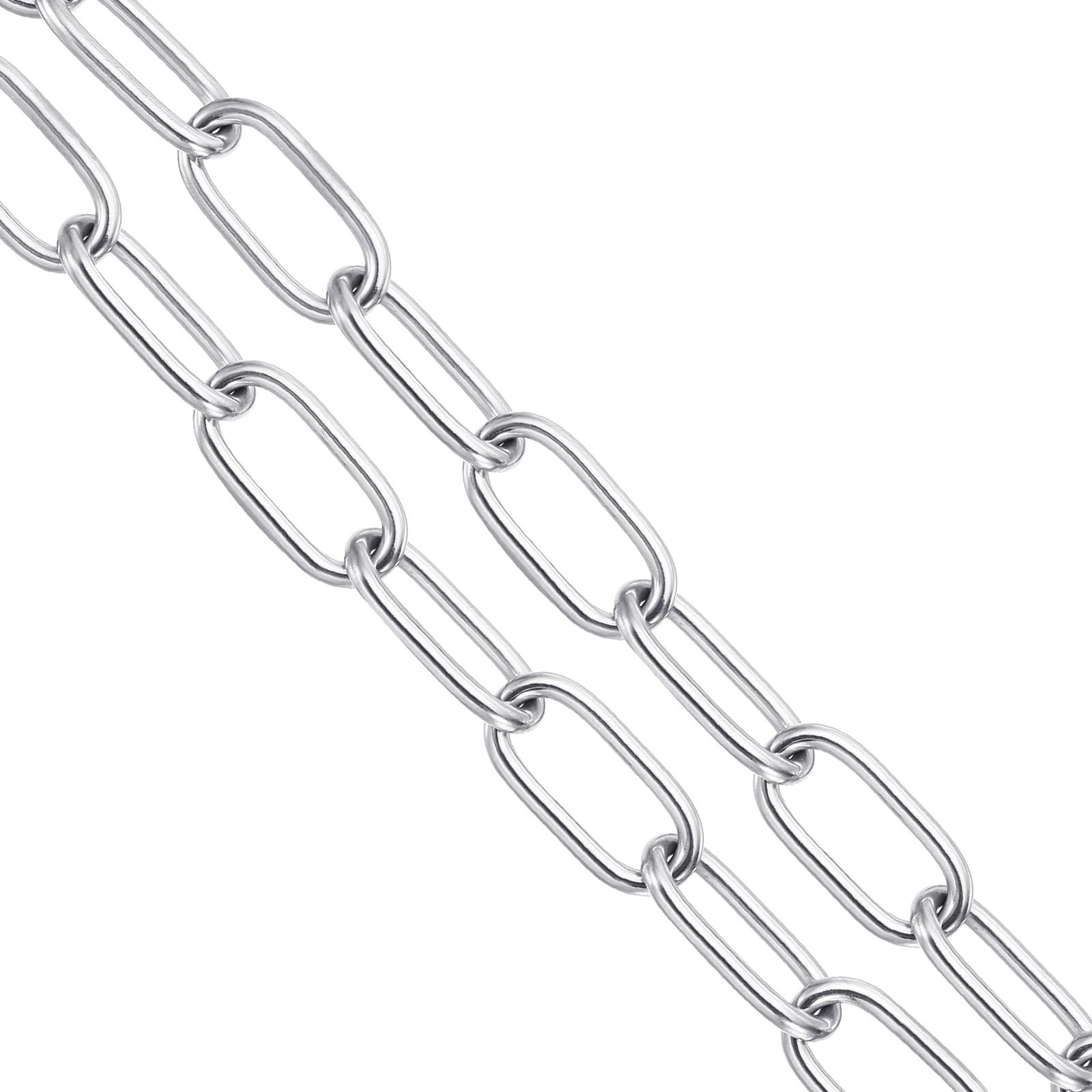 素材:当社のステンレススチールコイルチェーンは304ステンレススチール製で、優れた耐食性と長期にわたる耐久性をします。厳しい条件に耐え、信頼性の高いパフォーマンスを提供するように設計されています。(仕様: シングルチェーンリンクサイズ:17x8mm、厚さ:2 mm、全長:10 M、最大荷重:36kg / 79lb)