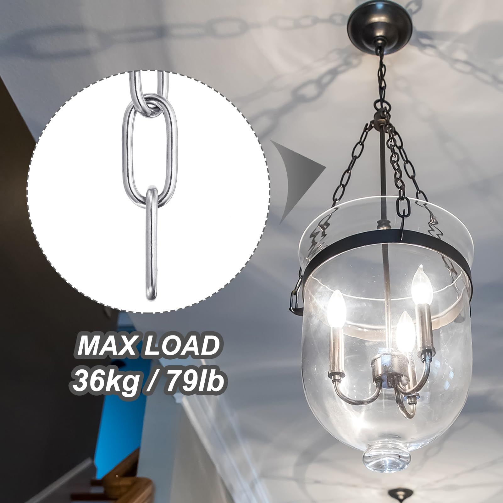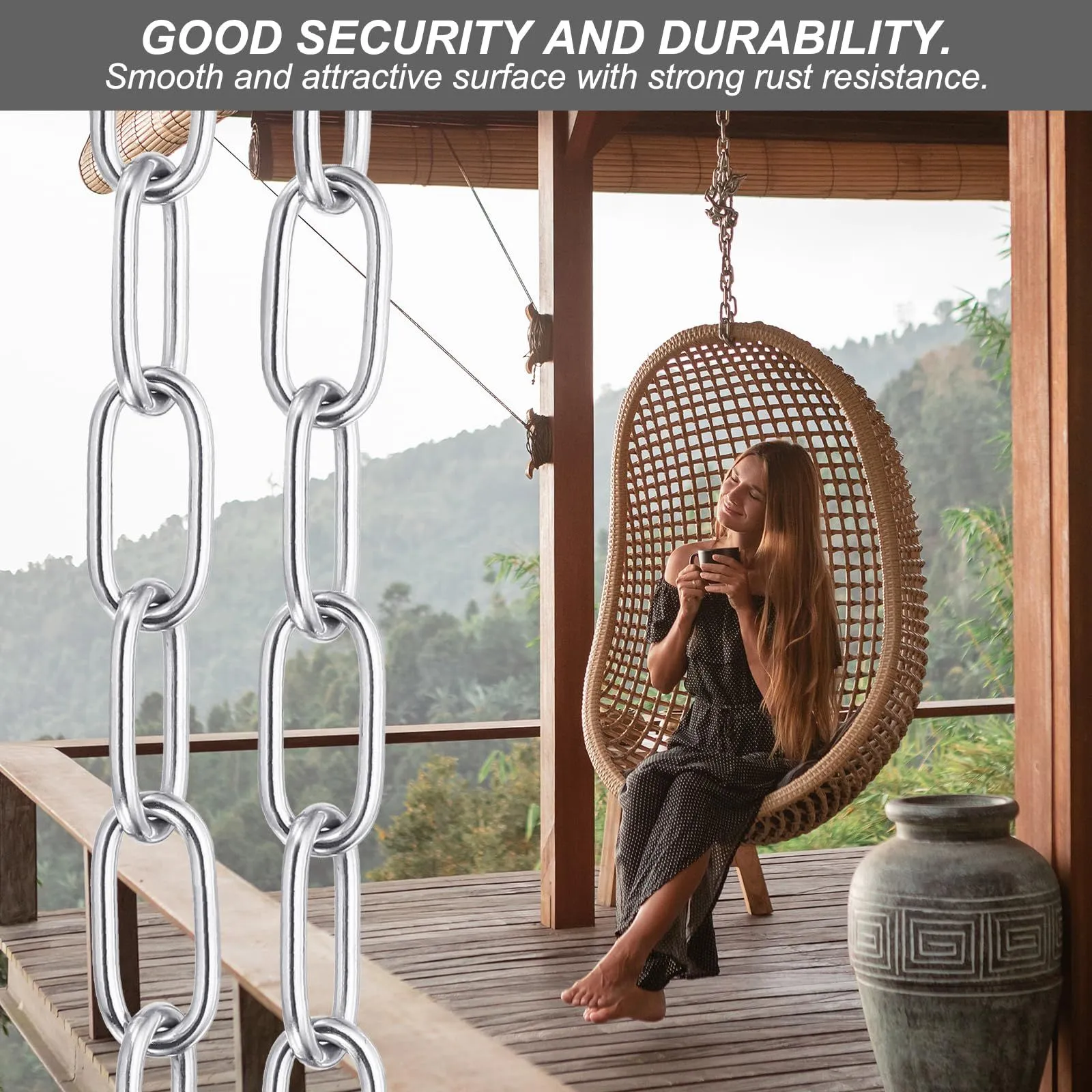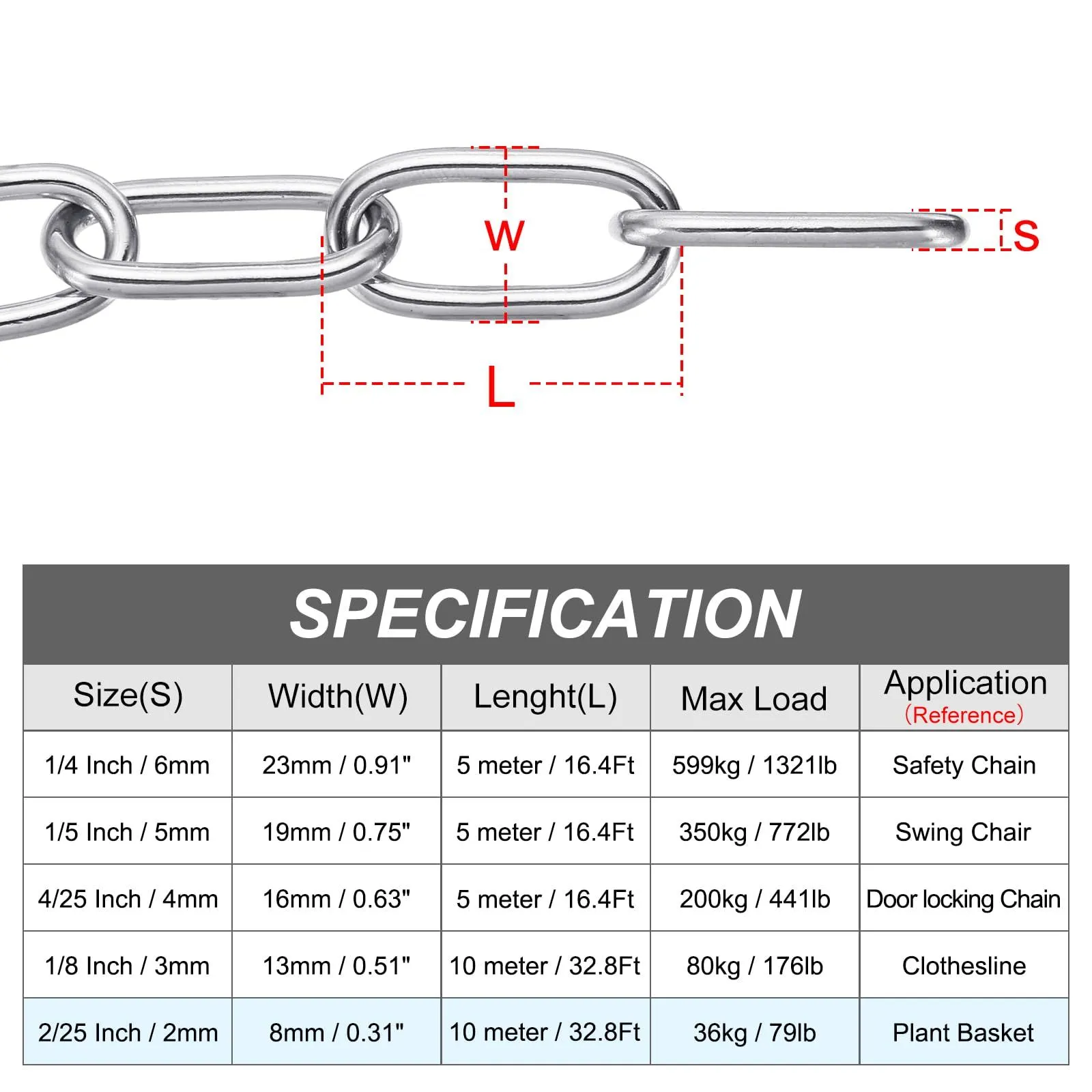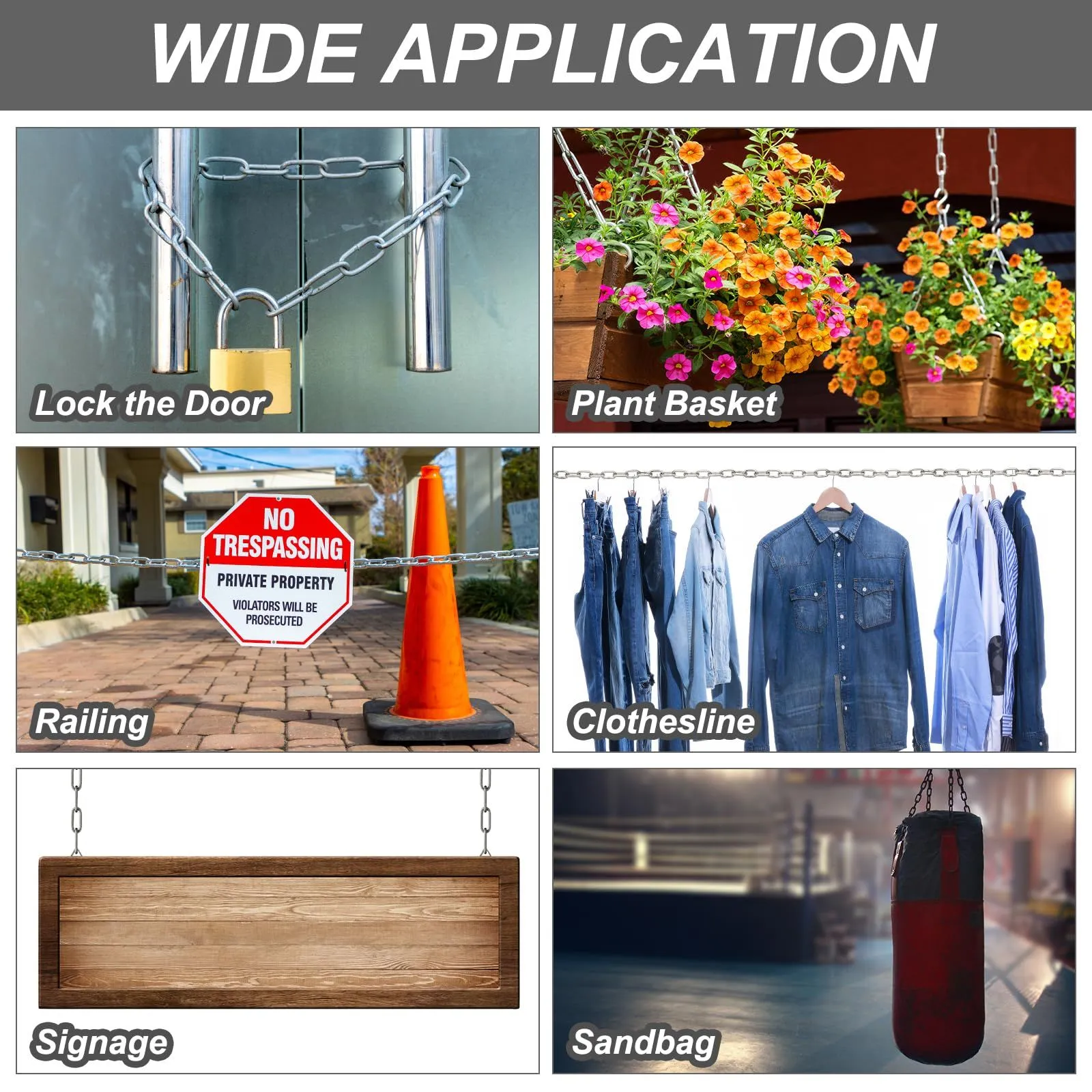 : この多用途チェーンは、トレーラーの牽引、スイングの吊り下げ、重量物の牽引、装置の吊り上げ、物品の固定や固定など、幅広い用途に最適です。産業環境、建設現場、植物バスケットの吊り下げ、シャンデリアの吊り下げ、フェンスの固定、または衣服の吊り下げによく使用されます。強度と耐久性があるため、さまざまなDIYプロジェクトや日常使用に適しています。