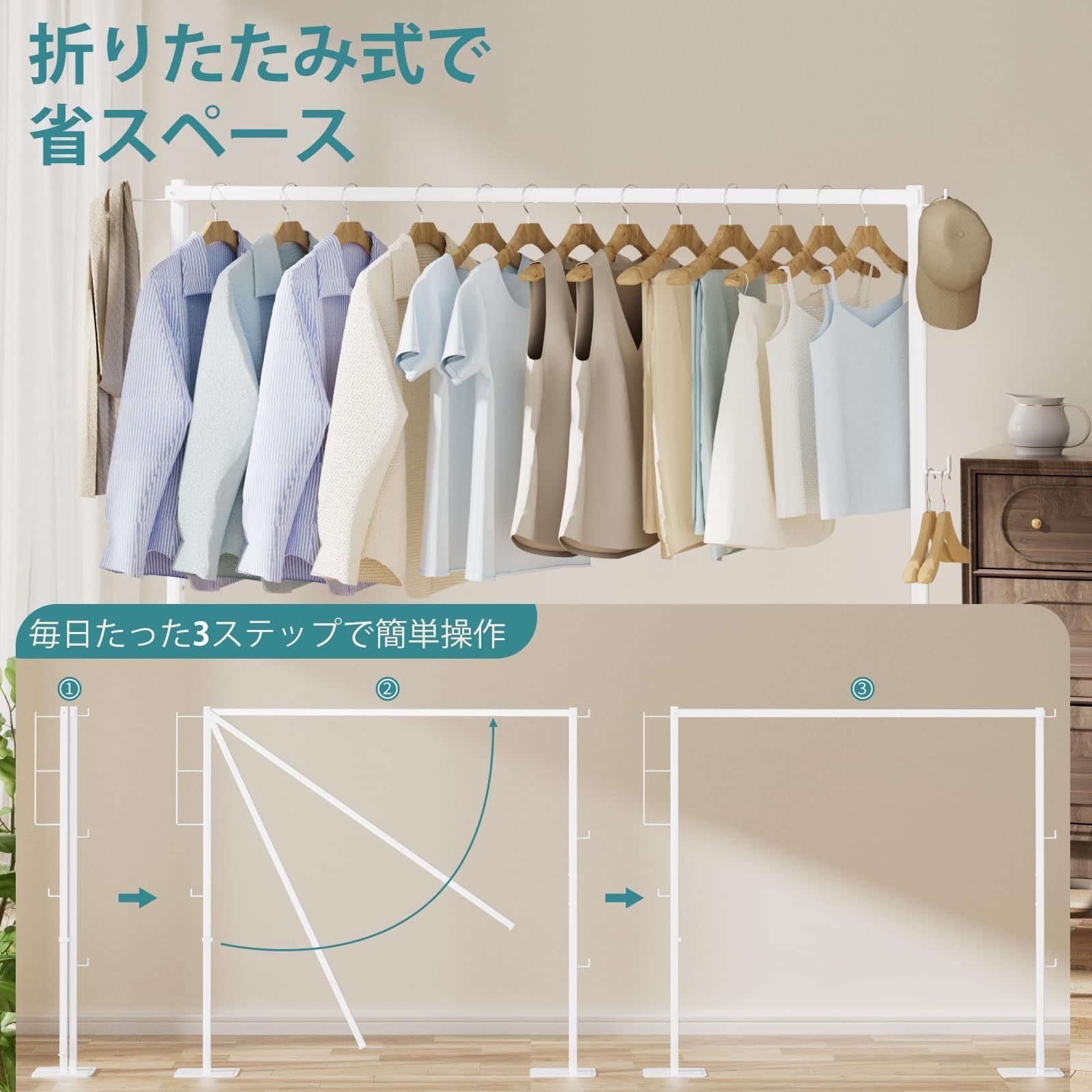 多機能フックで収納力抜群。支柱には使わないハンガーを掛けられるフックがあり、横のフックで洗濯物を種類別に整理できます。小さなフックには角ハンガーや洗濯バサミを掛け、収納時もバッグや帽子などをサッと掛けられます。折りたたみ時もフックを活用でき、使い勝手が非常に良いです