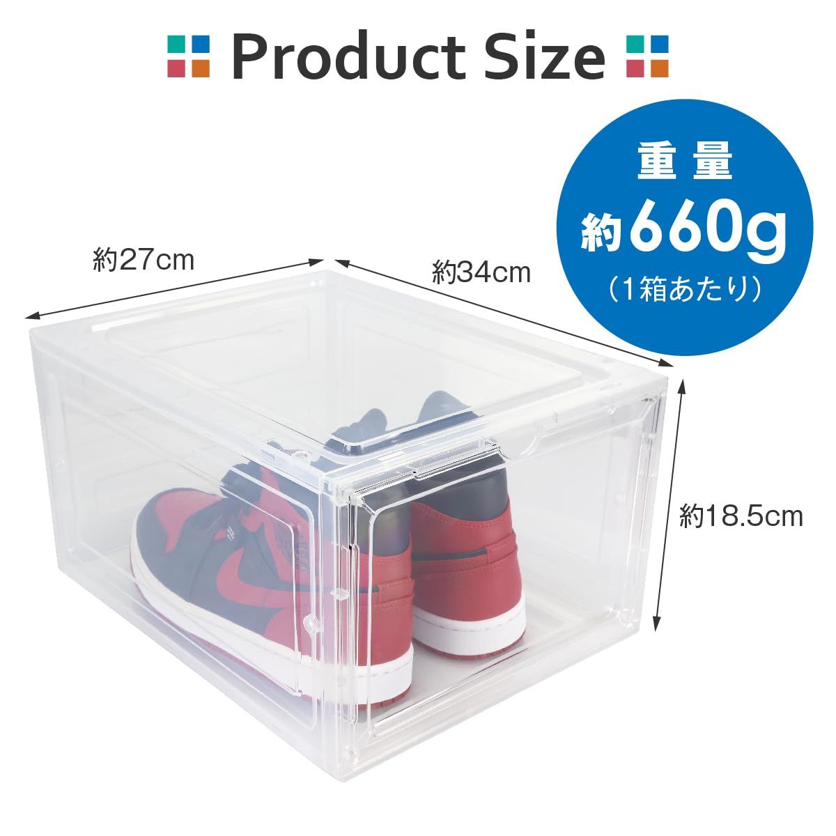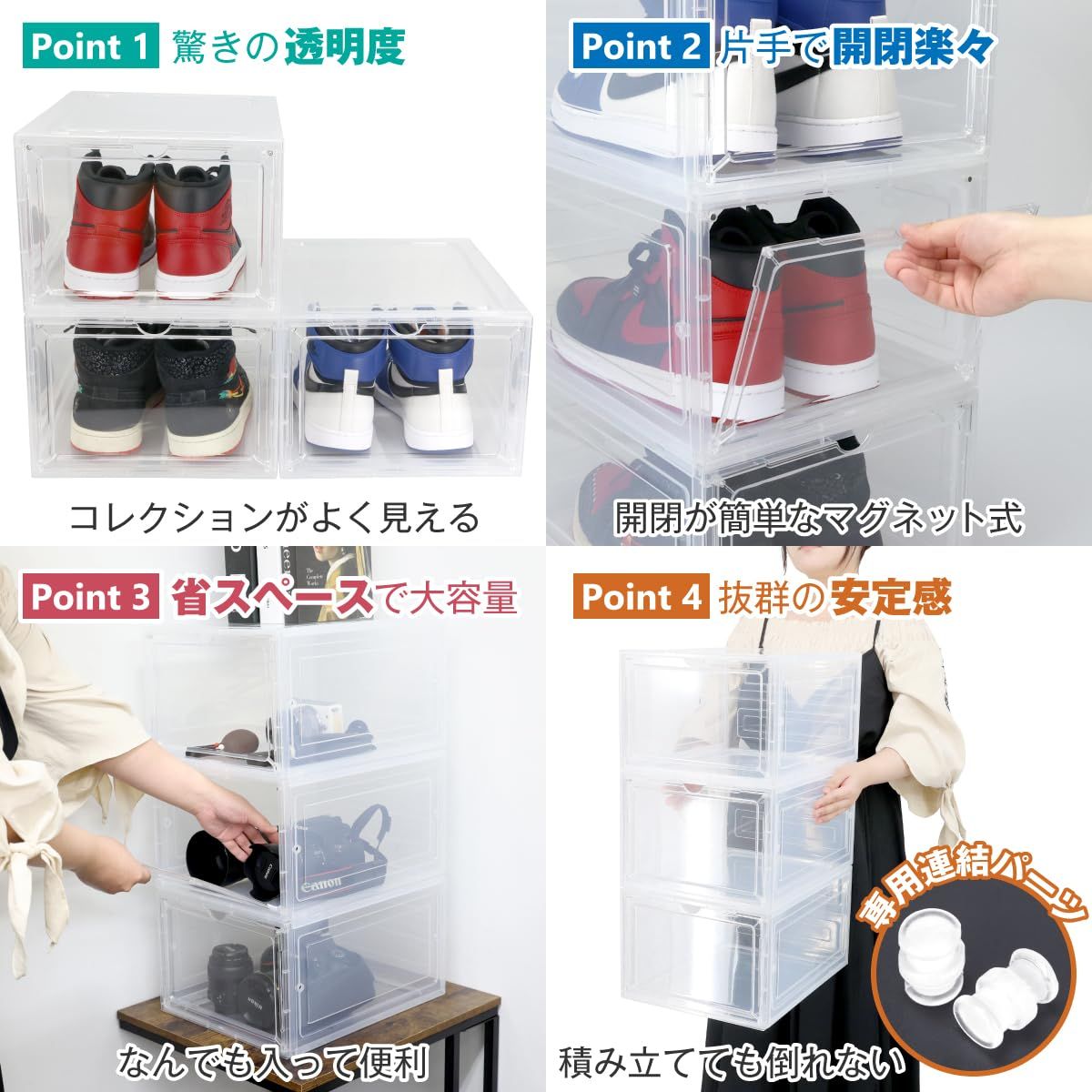 644g連結可能でスペース効率的:四方向に連結可能な透明クリアシューズボックス。スニーカーやフィギュア、化粧品の収納に最適。スリムで場所を取らず、マグネット棚を使用し、耐久性のあるプラスチック製で手軽に配置変更可能。簡単アクセスと耐久性:クリアなシューズボックスでスニーカーの収納とディスプレイが同時に可能。スニーカーラックとしても使用し、あらゆる収納ニーズに対応。汎用性の高いデザイン:クリアプラスチック製で水洗い可能、軽量で移動が簡単。玄関やリビングでの隙間収納に最適。フィギュアから小物、シューケアボックスまで多目的に使用可能。スリムな形状で効率的にスペースを活用。30日間の保証とサポート:弊社では「良い物をリーズナブルに」商品開発をしております。製品に万が一、不具合や気になることがございましたら、日本人スタッフが丁寧にご対応させていただきます。※サイズにつきまして、アクリル素材のため、若干の個体差(±0.2cm)が生じます、ご了承ください。