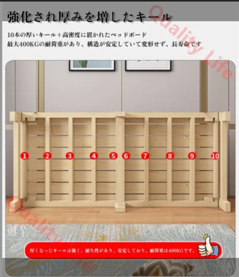 【強い支持力】太いスラットと独自のフレーム構造で高い耐久性を実現。 フレーム設計は頑丈で、耐荷重は300KGです。 壊れる心配がなく、しっかりと体を支えられて安心して眠れます。 ?