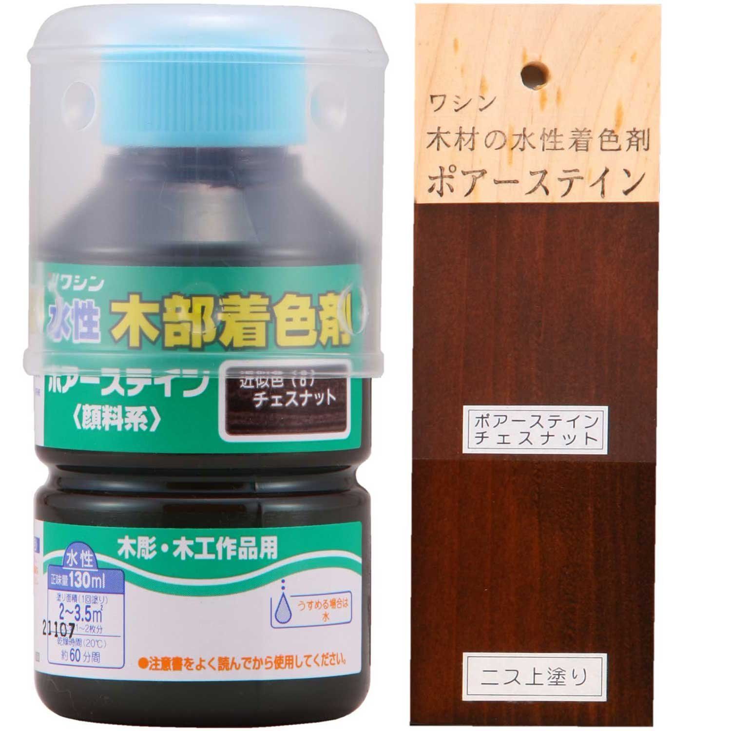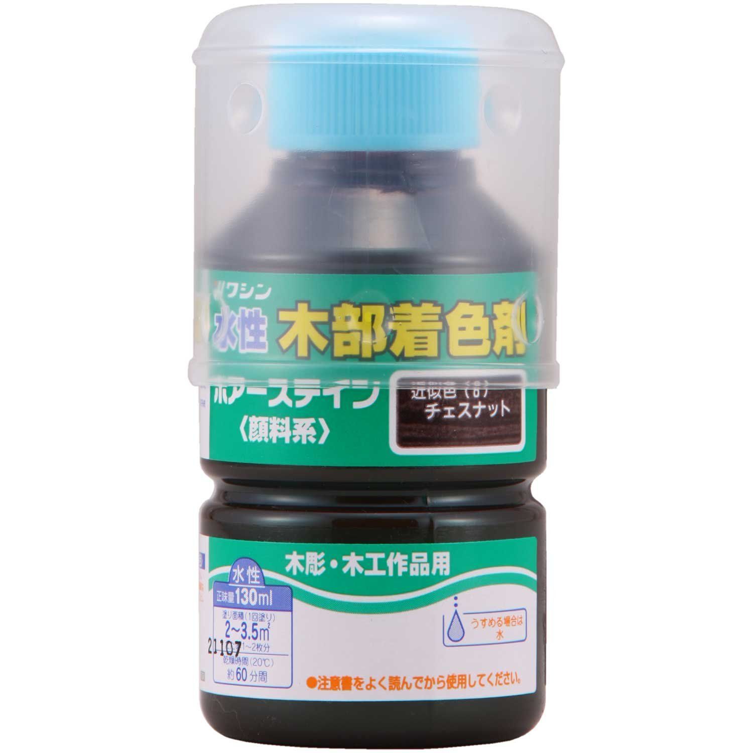 サイズ名:130ml | 色:チェスナット 木目を引き立てる水性顔料着色剤木に色をつけるためのステインと呼ばれる塗料の1つ色ムラになりにくく、木目を引き立てるカラーバリエーションが豊富※原液のまま使用できる。※色を薄くしたい場合は水(水道水)を加えてください。※「との粉」を混ぜると、着色と目止めが同時にできる。※木を保護する力はありません。必ずニスで上塗りしてください。水性・油性・ラッカーどのニスでも上塗りができる。※「水性オイルステイン」と比べると、木目がはっきりと出ます。ポアーステイン同士は、混ぜて使うことができる