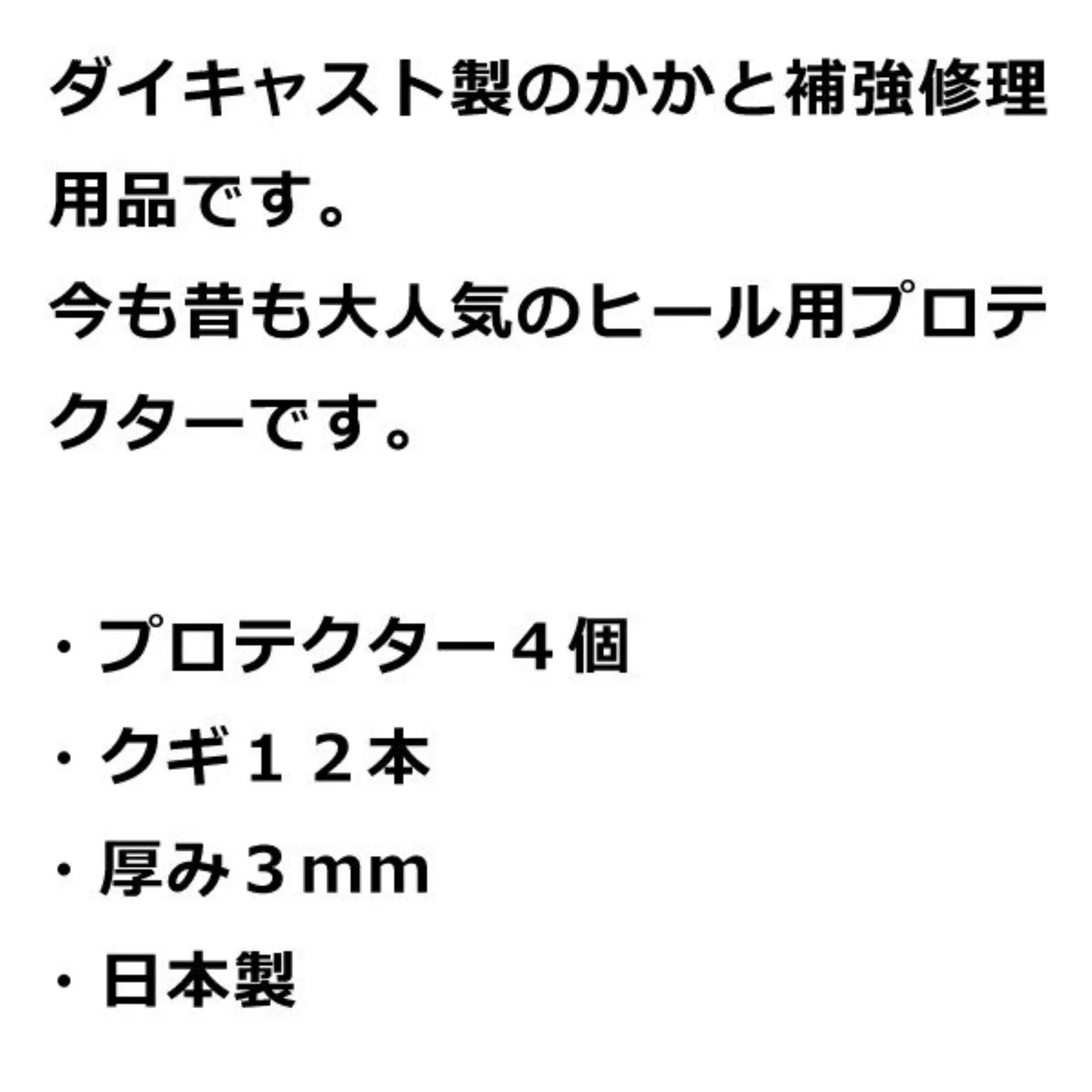 サイズ:40 ×12mm(厚み:3mm )、 製造:日本製、 セット内容:プロテクター:4個・クギ:12本、 今も昔も人気の靴修理材!かかとの修理・補強ができます。簡単取り付け。 ダイキャスト製のかかと補強修理用品です。