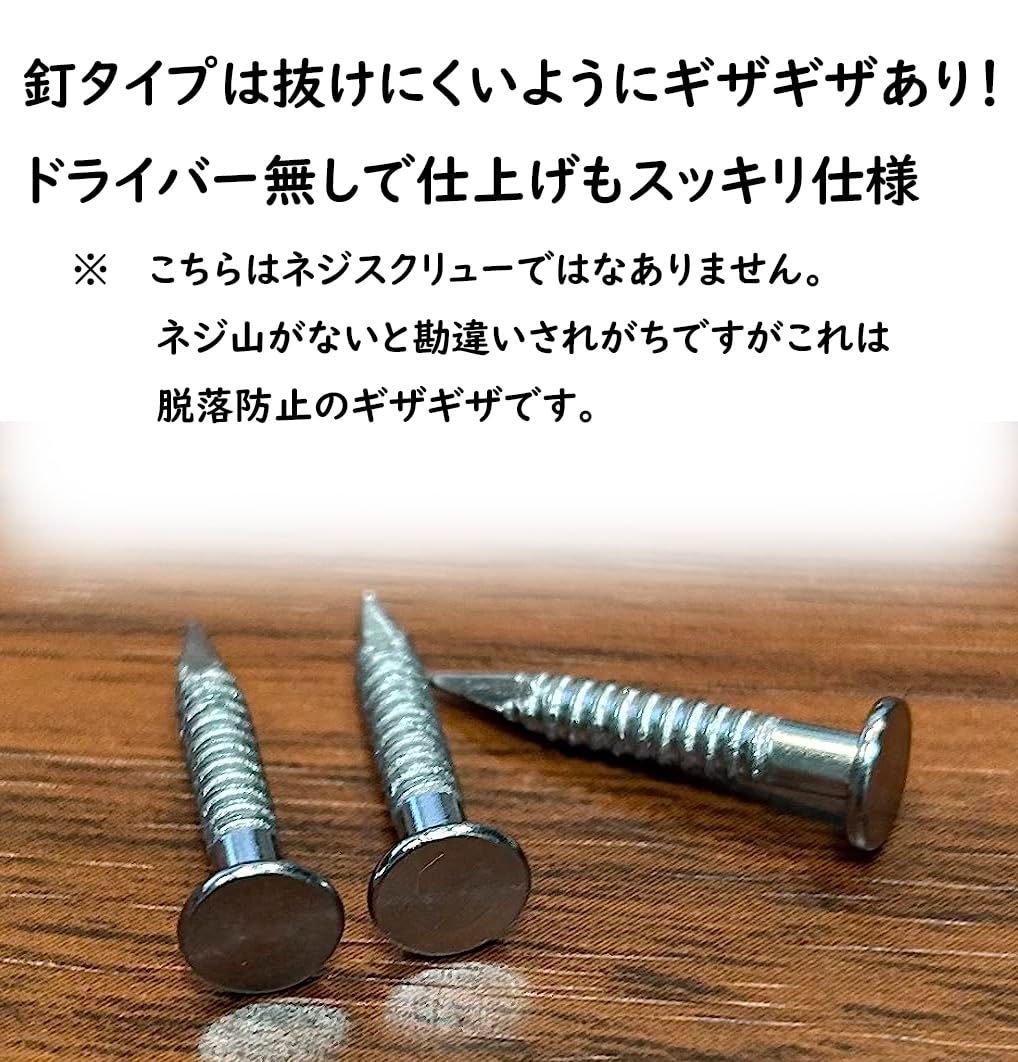 仕上がり面がすっきりが人気の釘タイプ。釘で固定するだけ。専門工具・接着剤不要!ドライバーネジ穴なくすっきりです。釘タイプですが抜けにくいようにギザギザがあります。 ※見た目はネジスクリュー風ですが、釘が脱落や抜け防止のギザギザです。