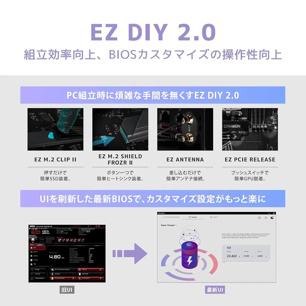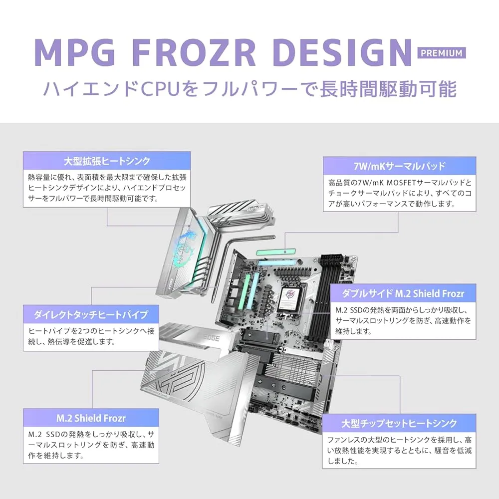 ●付属品:クイックスタートガイド、アクセサリキット、Wi-Fiアンテナ 「主な仕様」MB6584 日本正規代理店製品 保証3年 16フェーズ 90A SPS対応の電源回路を搭載し、最新CPUの性能を安定して発揮させます。 ヒートシンクとPCBがホワイトカラーで統一されており、ホワイトPCとの組み合わせに最適です。 ヒートパイプと大型ヒートシンクにより、VRMを効率的に冷却し、システムの安定性を維持します。 EZ M.2 CLIP IIとEZ M.2 Shield Frozr IIを採用し、M.2 SSDの取り付けや取り外しが簡単に行えます。