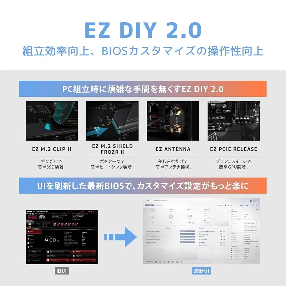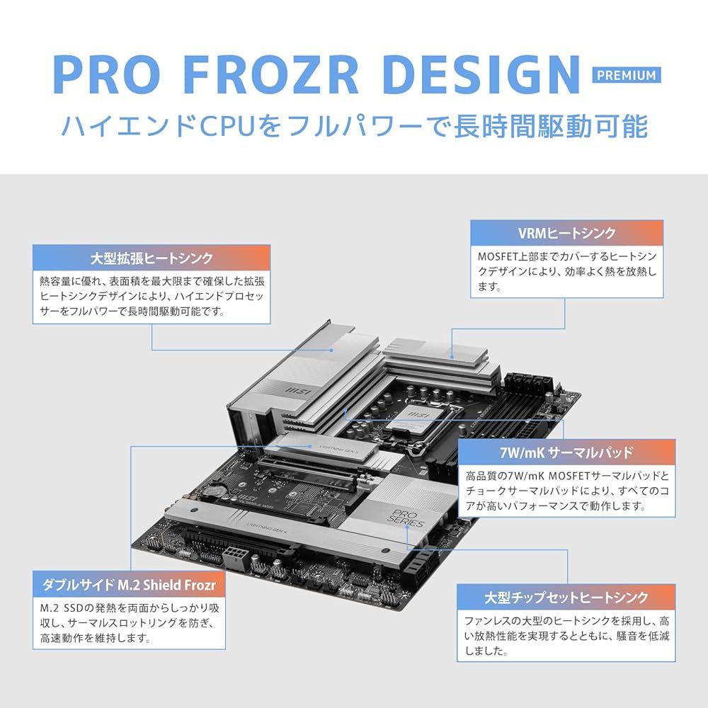 ●付属品:クイックスタートガイド、アクセサリキット、Wi-Fiアンテナ 「主な仕様」MB6586 日本正規代理店製品 保証3年 16フェーズ 90A SPS対応の電源回路を搭載し、最新CPUを安定して動作させることができます。 黒基板にホワイトシルバーのヒートシンクを採用し、白黒どちらのセットアップにもマッチするデザインです。 リアI/Oパネルまで拡張された大型ヒートシンクがVRMを効率的に冷却し、システムの安定性を確保します。 5G LAN、Wi-Fi 7、Thunderbolt 4ポートを搭載し、あらゆる高速ネットワーク環境に対応します。