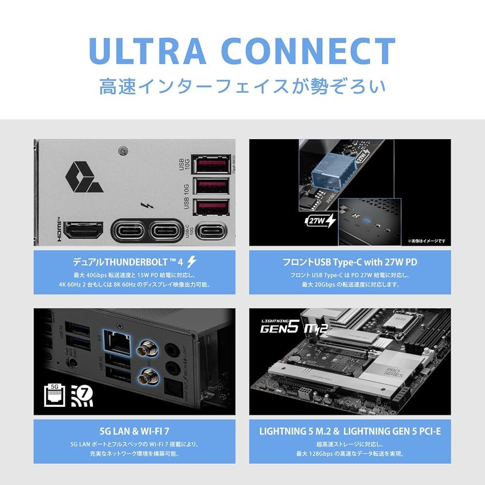 ●ストレージ:M.2スロット×4(PCIe5.0x4 ×1、PCIe4.0x4 ×3)、SATA 3 6Gb/s×4